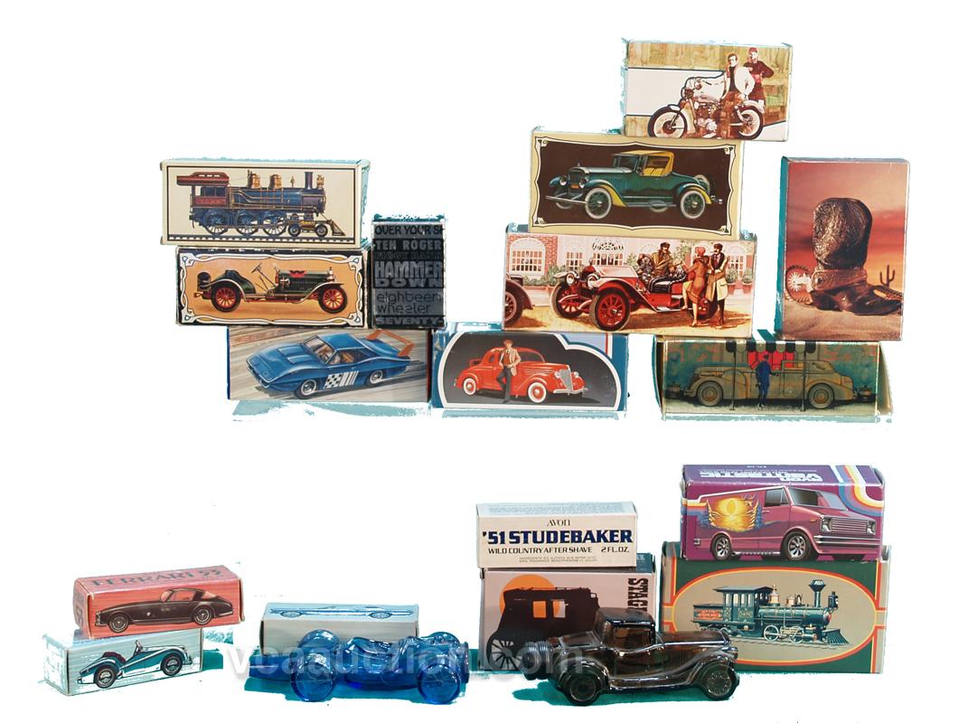 Lot Of 22 Collectable Avon Bottles In Shapes Of Autos, Trains, Etc.