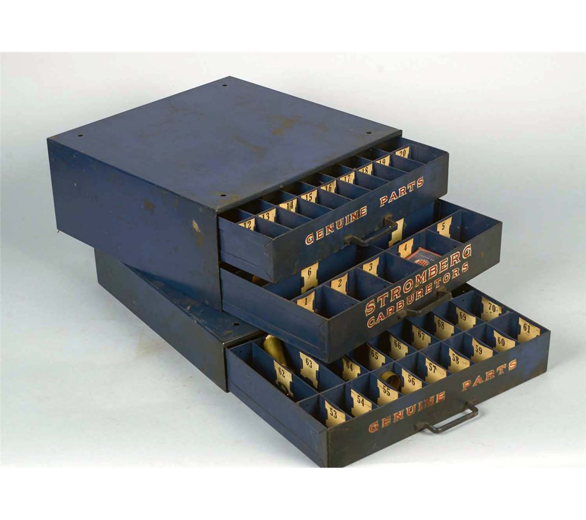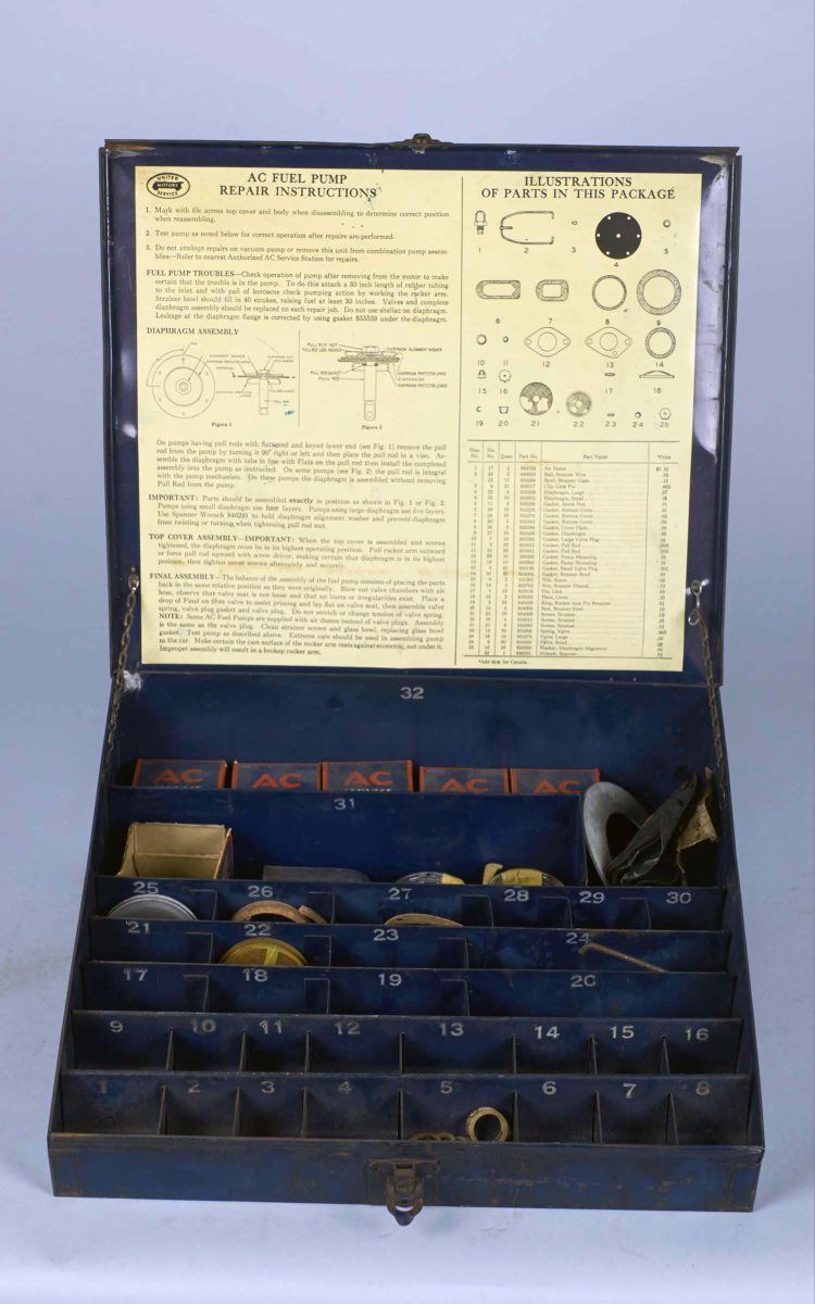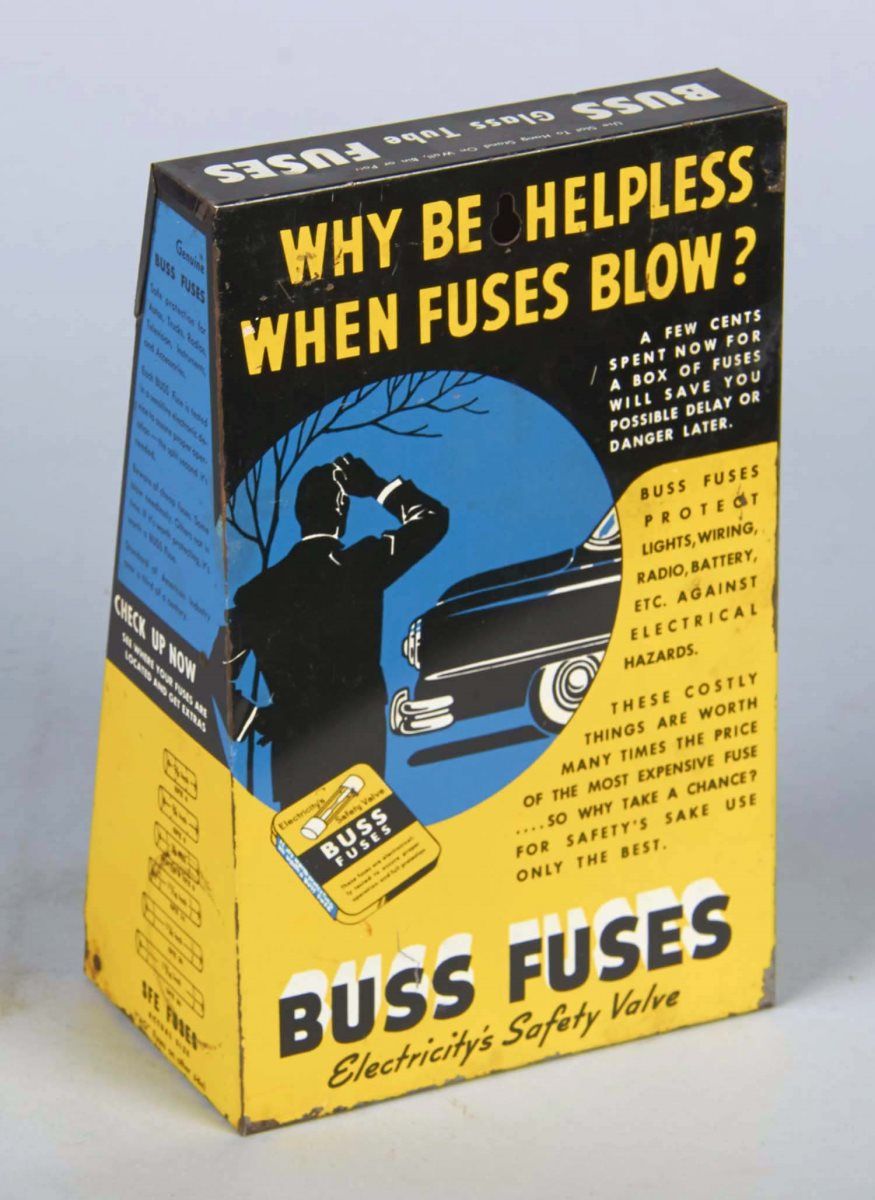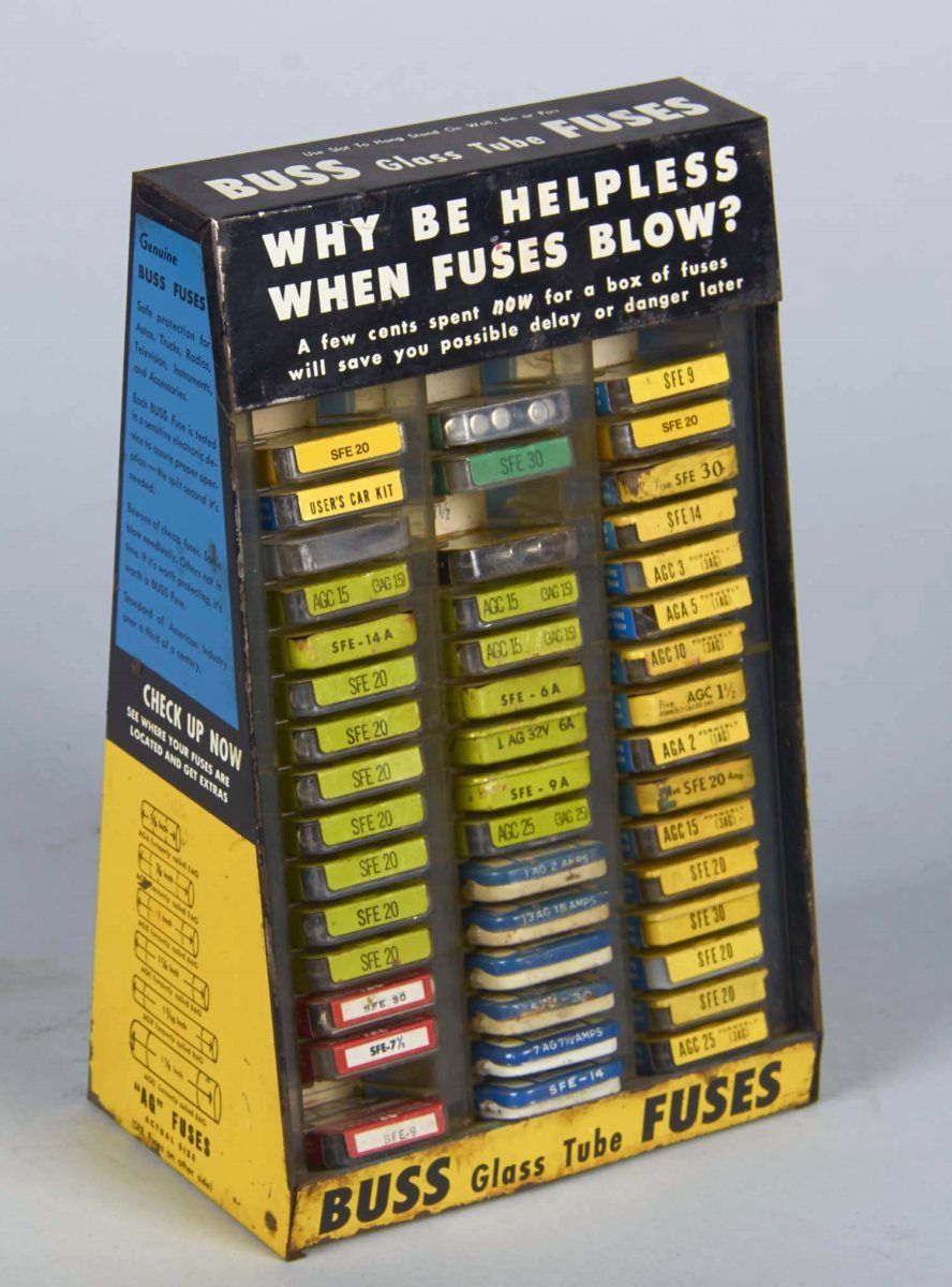 Including 1 - Countertop Buss Fuse display with fuses circa 1960s, 1 - Set of three metal drawers lithographed, "Genuine Parts" and "Stromberg Carburetors" circa 1960s, and 1 - United Motors Service metal counter display for genuine AC parts circa 1960s.