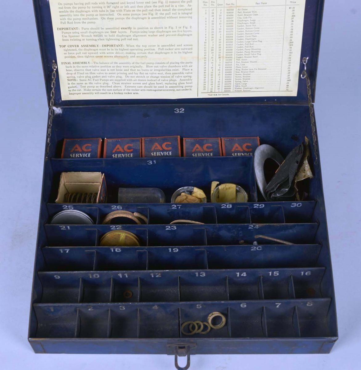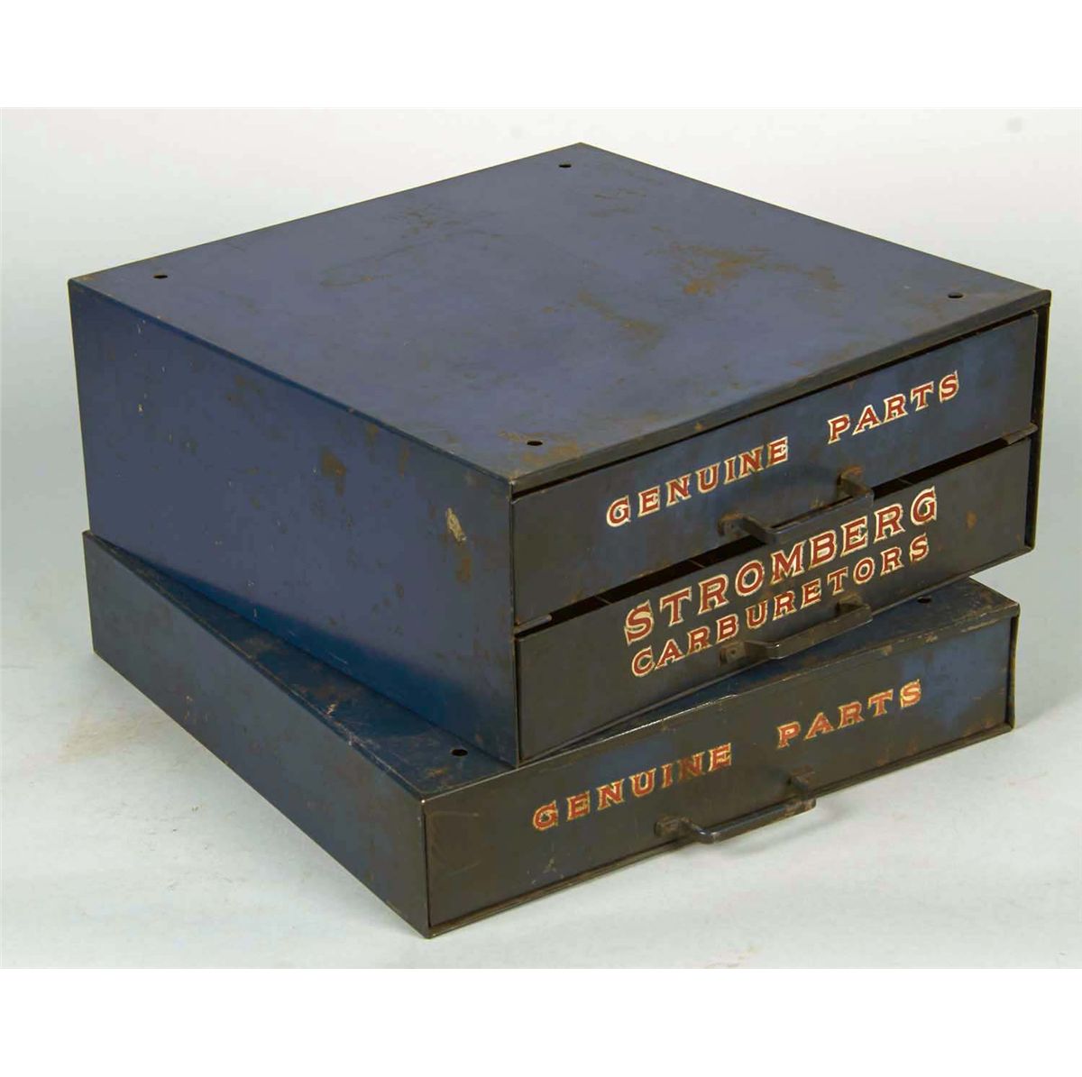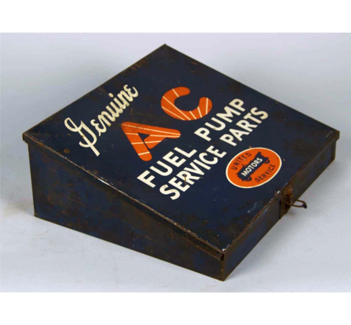 Including 1 - Countertop Buss Fuse display with fuses circa 1960s, 1 - Set of three metal drawers lithographed, "Genuine Parts" and "Stromberg Carburetors" circa 1960s, and 1 - United Motors Service metal counter display for genuine AC parts circa 1960s.