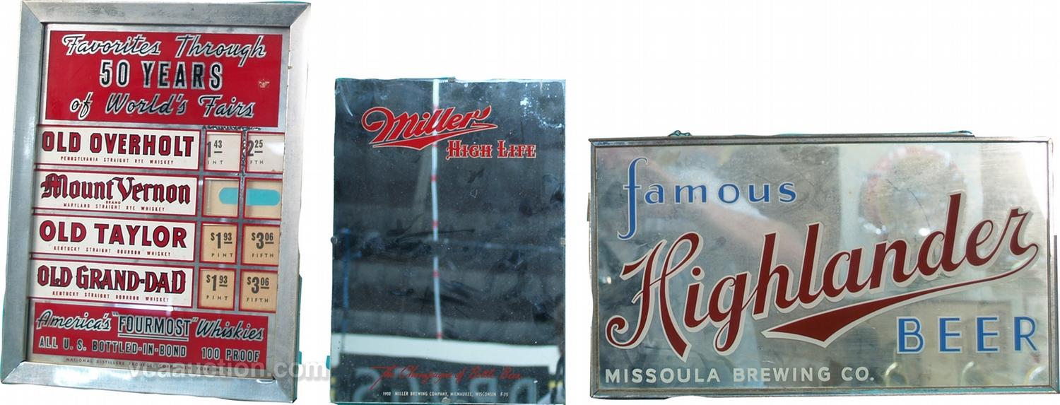 Lot Of 3 Bar Alcohol Advertising Signs/Mirrors: 1 - Highlander Beer mirror - 18" x 10", 1 - Miller High Life mirror - 9" x 13" & 1 - America's "Four-Most" Whiskies reverse on glass price sign - 12" x 15"