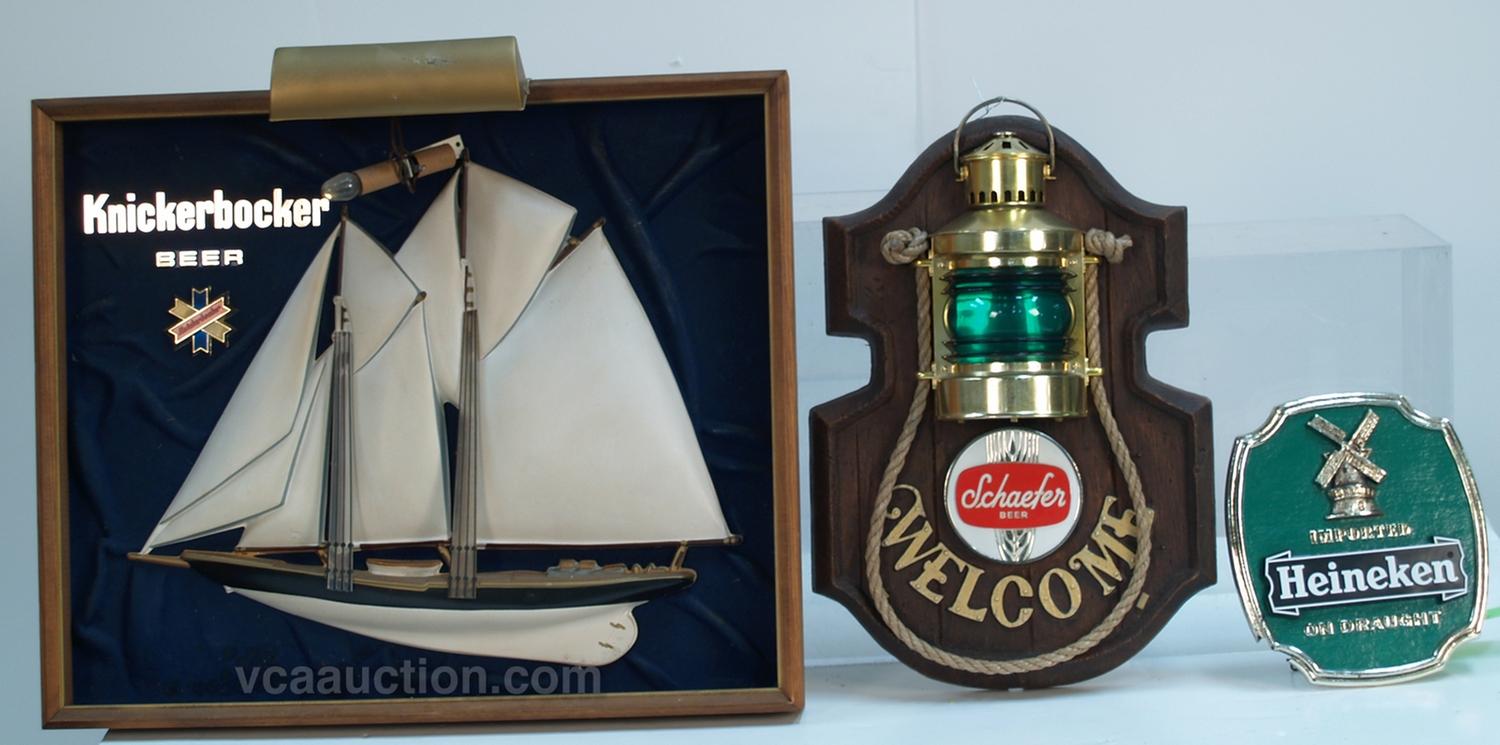 Lot Of 3 Beer Advertising Items: 1 - plastic Heineken Beer display plaque - 8" x 10", 1 - Schaefer Beer plastic wall mount lantern light-up sign - 13" x 19" & 1 - Knickerbocker Beer plastic 3-D ship display in wood frame w/ light - 24" x 20"