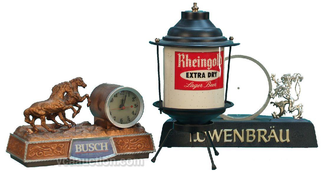 Lot Of 3 Beer Countertop Displays: 1 - Busch Beer light-up sign w/ clock, 1 - Lowenbrau light-up sign w/ clock (not working) & 1 - Rheingold Beer light-up lantern (works)