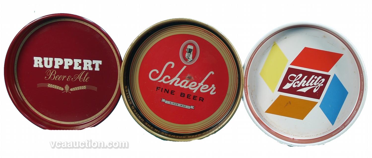 Lot Of 3 Beer Tin Serving Trays: 1 - Ruppert Beer & Ale, 1 - Schaefer Fine Beer & 1 - Schlitz, each 13" diam