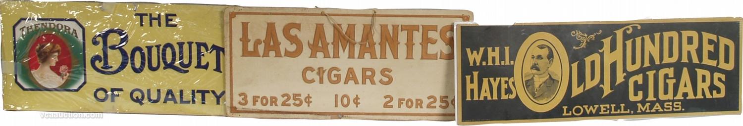 Lot Of 3 Cardboard Cigar Signs: 1 - LD Hundred Cigars sign - 18" x 6", 1 - Thendora Cigars embossed sign - 15" x 7" & 1 - Las Amantes Cigars embossed sign - 15" x 7"
