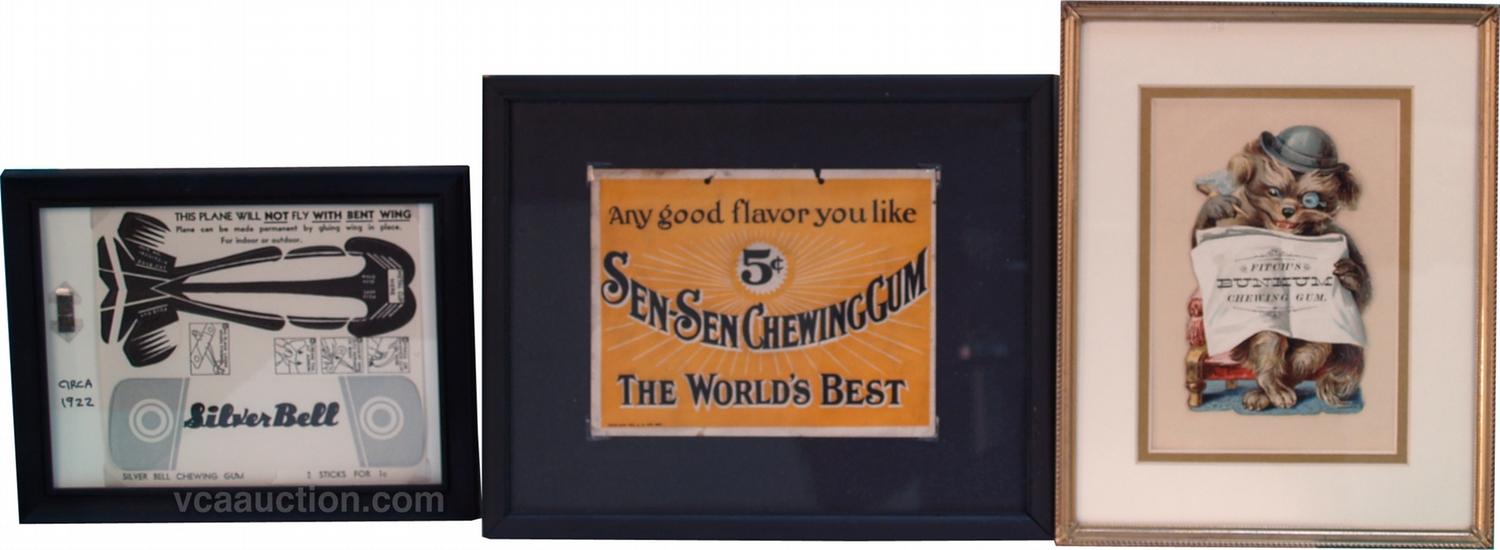 Lot Of 3 Chewing Gum Advertisement Signs In Frames: 1 - Sen-Sen Gum embossed cardboard ad- 6" x 5", 1 - Silver-Bell Gum cardboard die-cut airplane cut-out c1922 - 6" x 6" & 1 - Fitch's Bunkum Chewing Gum embossed die-cut cardboard ad - 4" x 6"