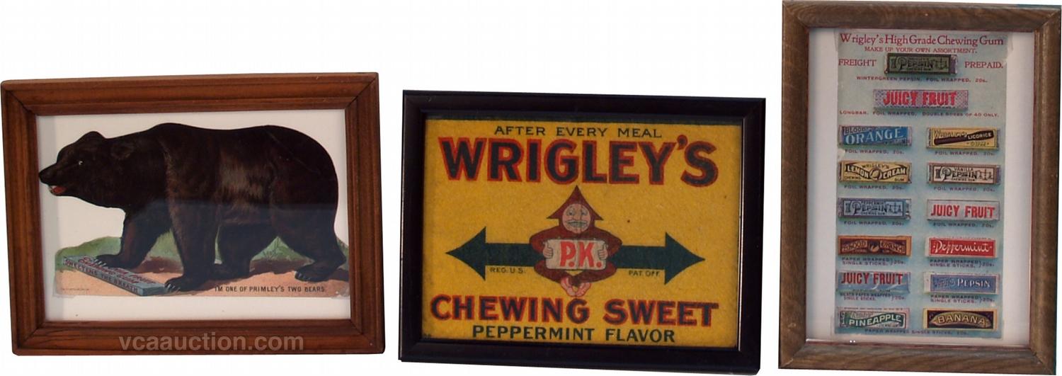 Lot Of 3 Chewing Gum Advertisements In Frames: 1 - Wrigley Gum paper ad c1900 - 6" x 8", 1 - Wrigley P.K. Gum felt ad - 8" x 6" & 1 - Primley's Gum die-cut cardboard bear ad - 7" x 5"