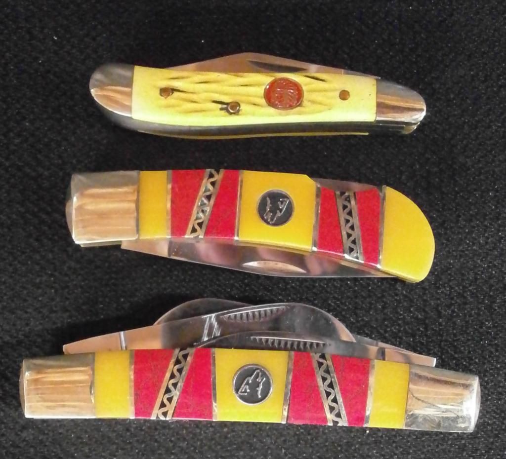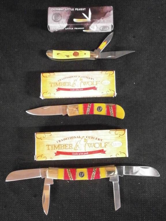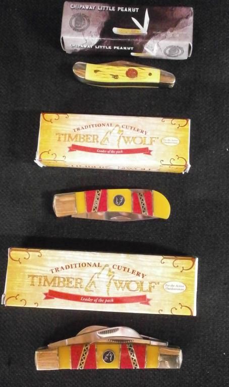 Knife W/Stainless Steel Mirror Finished Blades, Nickel Silver Bolsters & Banana Jigged Bone Handle. Timber Wolf 3 1/2" Desert Sun Turquoise Handled Congress Knife W/Stainless Steel Blades. Timber Wolf Desert Sun 3" Lockback Knife W/Stainless Steel Blade