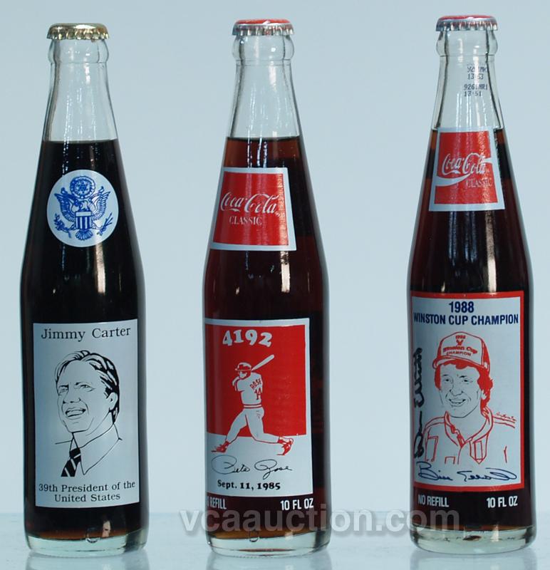Lot Of 3 Commemorative Unopened Coca Cola Bottles: 1 - Jimmy Carter, 1 - 1988 Winston Cup Champion Bill Elliot (signed) & 1 - Pete Rose (signed)