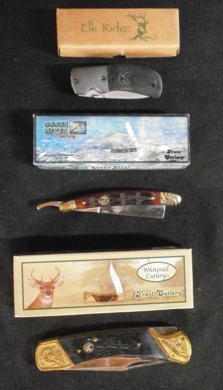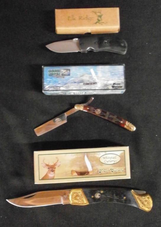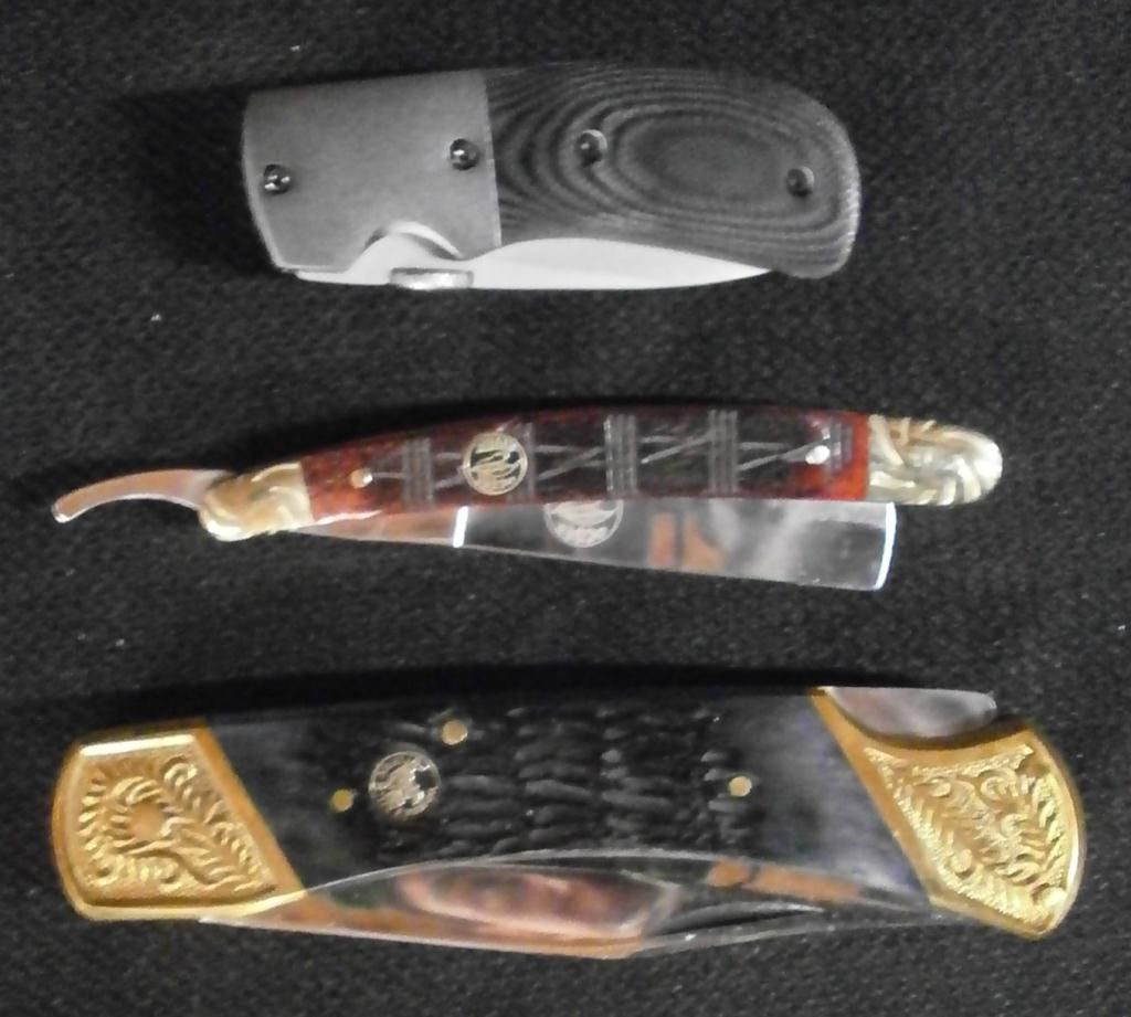Stainless Steel Mirror Blade, Ti+Mikarta Black Wood Handle & Pocket Clip. Ocoee River Razor 4" Knife W/Polished Stainless Steel Blade, Swirl Nickel Silver Bolsters, & brownish Red Turtle Bone Handle. Whitetail Bear Claw 5" Lockback Knife, W/Polished Stainless Steel Blade, Embossed Brass Bolsters & Genuine Jigged Bone Handle.