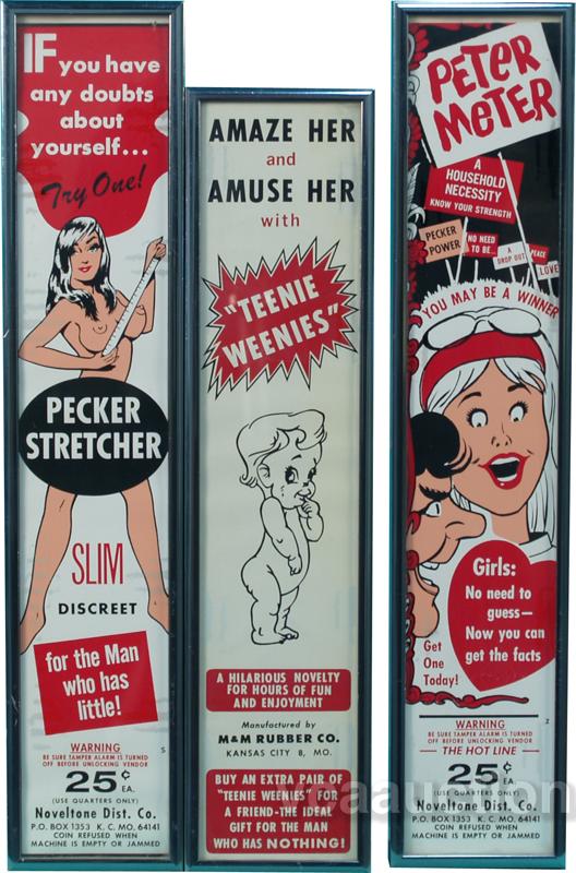 Lot Of 3 Framed Prophylactic Vending Machine Advertisements:  1 - "Peter Meter" - 3" x 17", 1 - "Pecker Stretcher" - 3" x 17" & 1 - "Teenie Weenies" - 3" x 15"