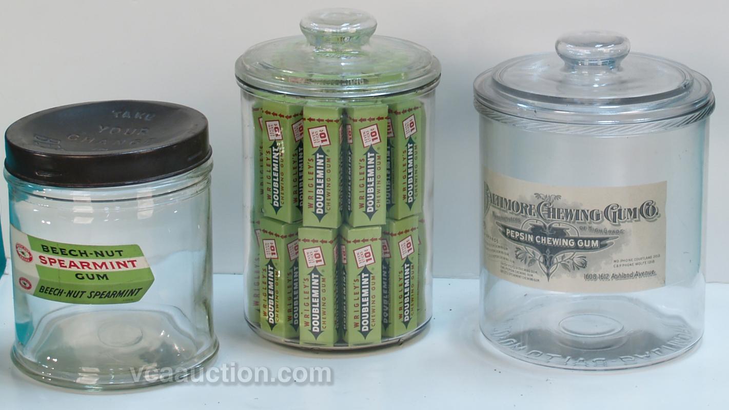 Lot Of 3 Glass Chewing Gum Jars: 1 - Beech-Nut Spearmint Gum w/ embossed tin lid "Take Your Change In Beech-Nut", 1 - Baltimore Chewing Gum Co. embossed glass bottom w/ glass lid & 1 - Wrigley's Spearmint Gum embossed glass bottom w/ glass lid