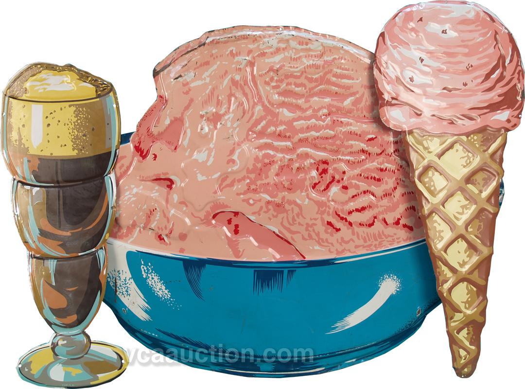 Lot Of 3 Ice Cream Parlor Die-Cut Embossed Tin Signs/Pictures: 1 - ice cream cone - 28" x 12", 1 - malt/shake - 24" x 9" & 1 - bowl of ice cream - 36" x 26"