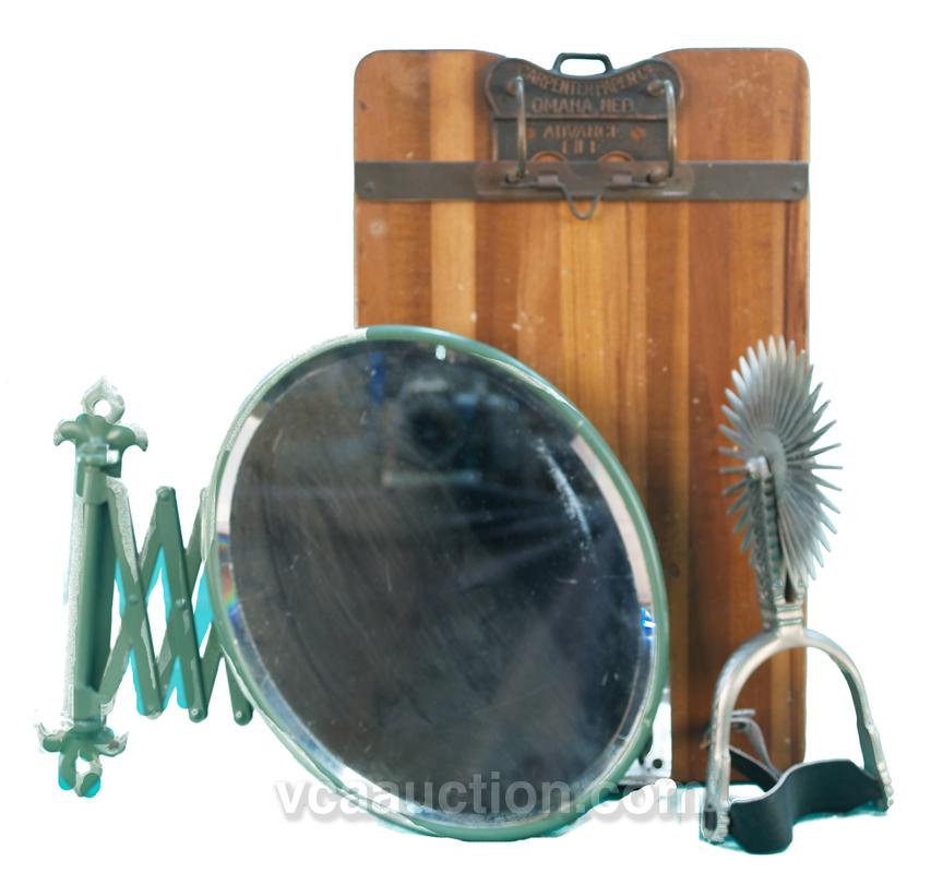 Lot Of 3 Items: Antique Clip Board - Carpenter Paper Co. Omaha NEB., Wall Mount Extension Mirror- Green & 1 Western Spur.