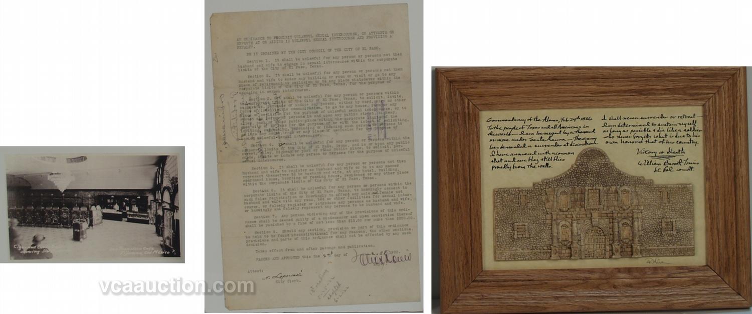 Lot Of 3 Items Including: official letter of "An Ordinance To Prohibit Unlawful Sexual Intercourse, Or Attempts Or Efforts At Or Aiding In Unlawful Sexual Intercourse And Providing A Penalty" For City Of El Paso signed by the Mayor June 2nd, 1922, etc.