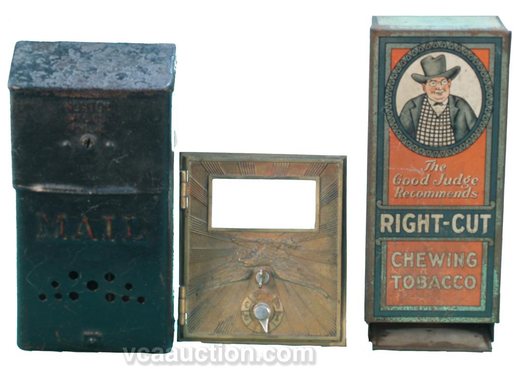 Lot Of 3 Items: Right-Cut Chewing Tobacco Tin Countertop Store Display, Old Hanging Mailbox (Black) By Norton MFG Co. & Brass Post Office Box Door w/ Eagle.