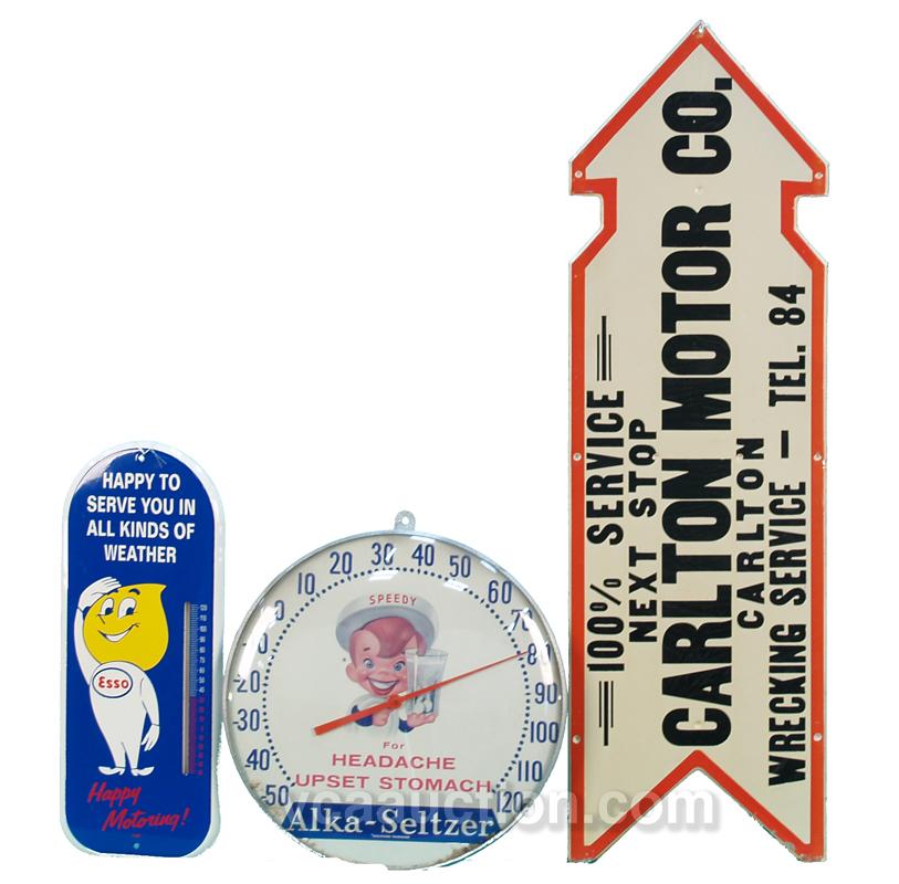 Lot Of 3 Items: 1 - Alka-Seltzer thermometer - 12" diam, 1 - Esso boy "Happy Motoring" porcelain sign w/ thermometer - 6" x 15" & 1 - Carlton Motor Co. die-cut arrow tin sign - 30" x 9"