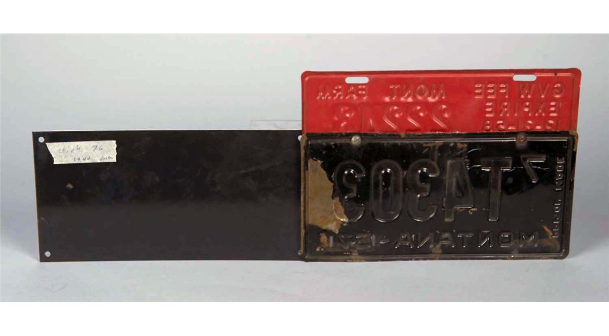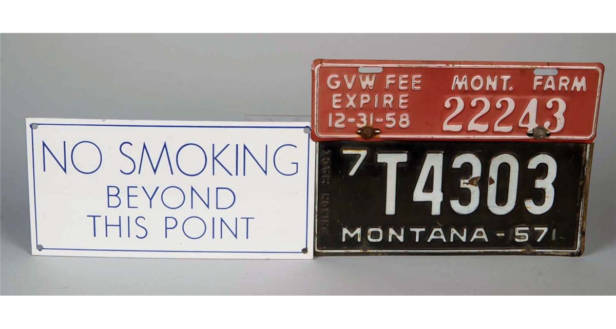 Including 1- No Smoking Gas Station sign from a Union 76, 1- You Can Depend Upon American Tiger Brand Wire American Steel tin litho sign with paint loss and some surface rust, and 1- 1957 Prison Made embossed Montana License plate with1958 Farm fee GVW to