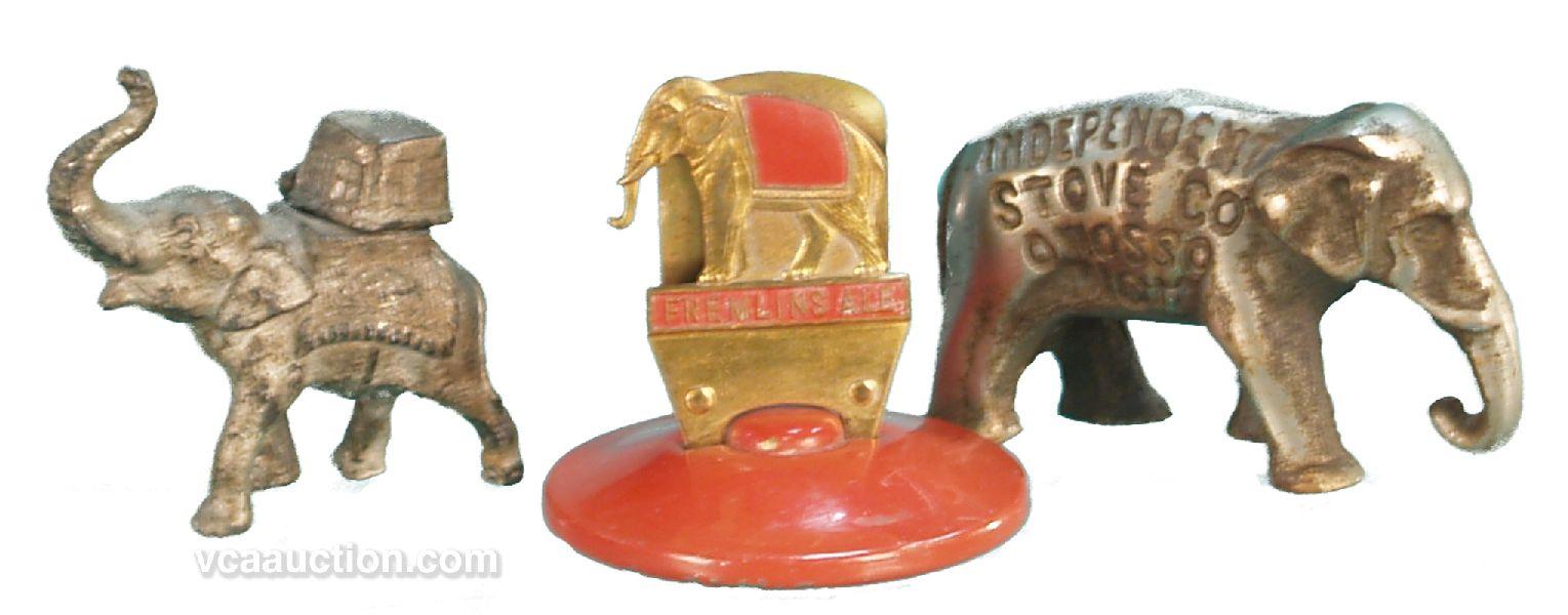 Lot Of 3 Mini Elephant Figures: 1 - is a lighter, 1 - letter holder & 1 - cast-iron Independent Stove Co.