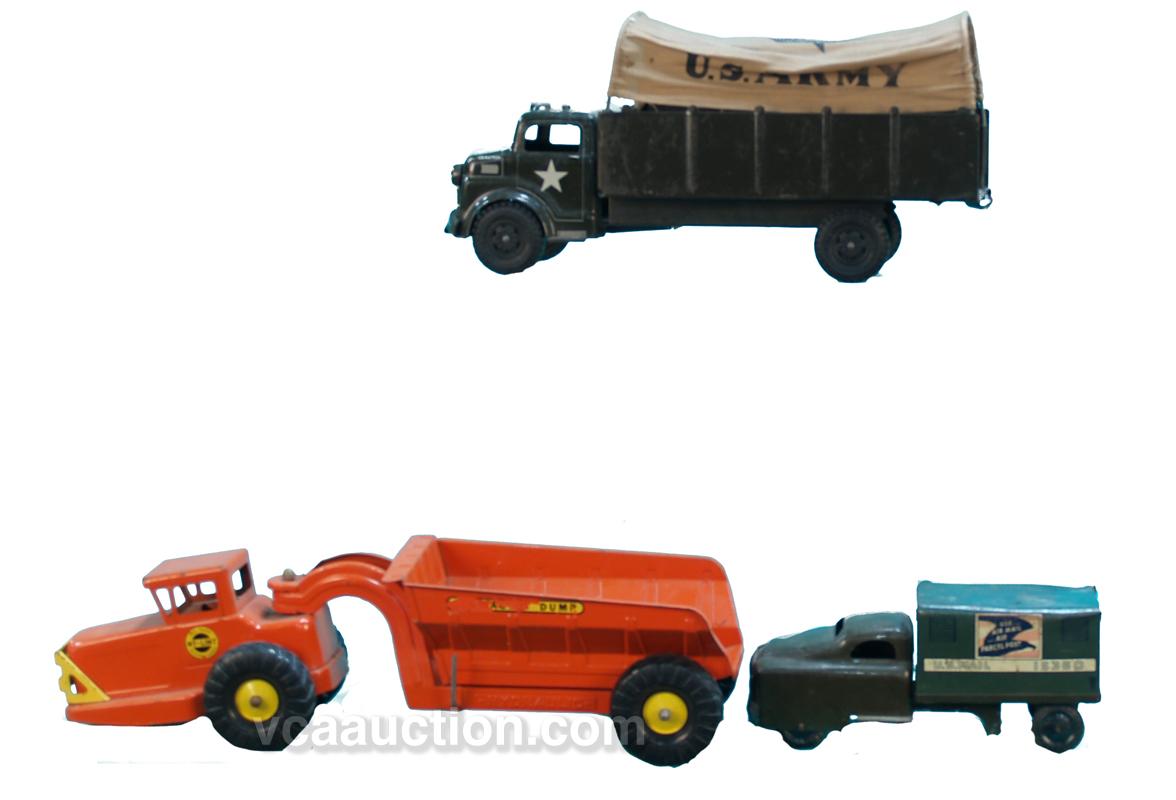 Lot Of 3 Old Metal Toy Trucks: 1 - Army truck, 1 - US mail truck & 1 - tractor style puller w/ trailer