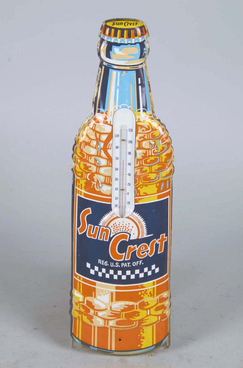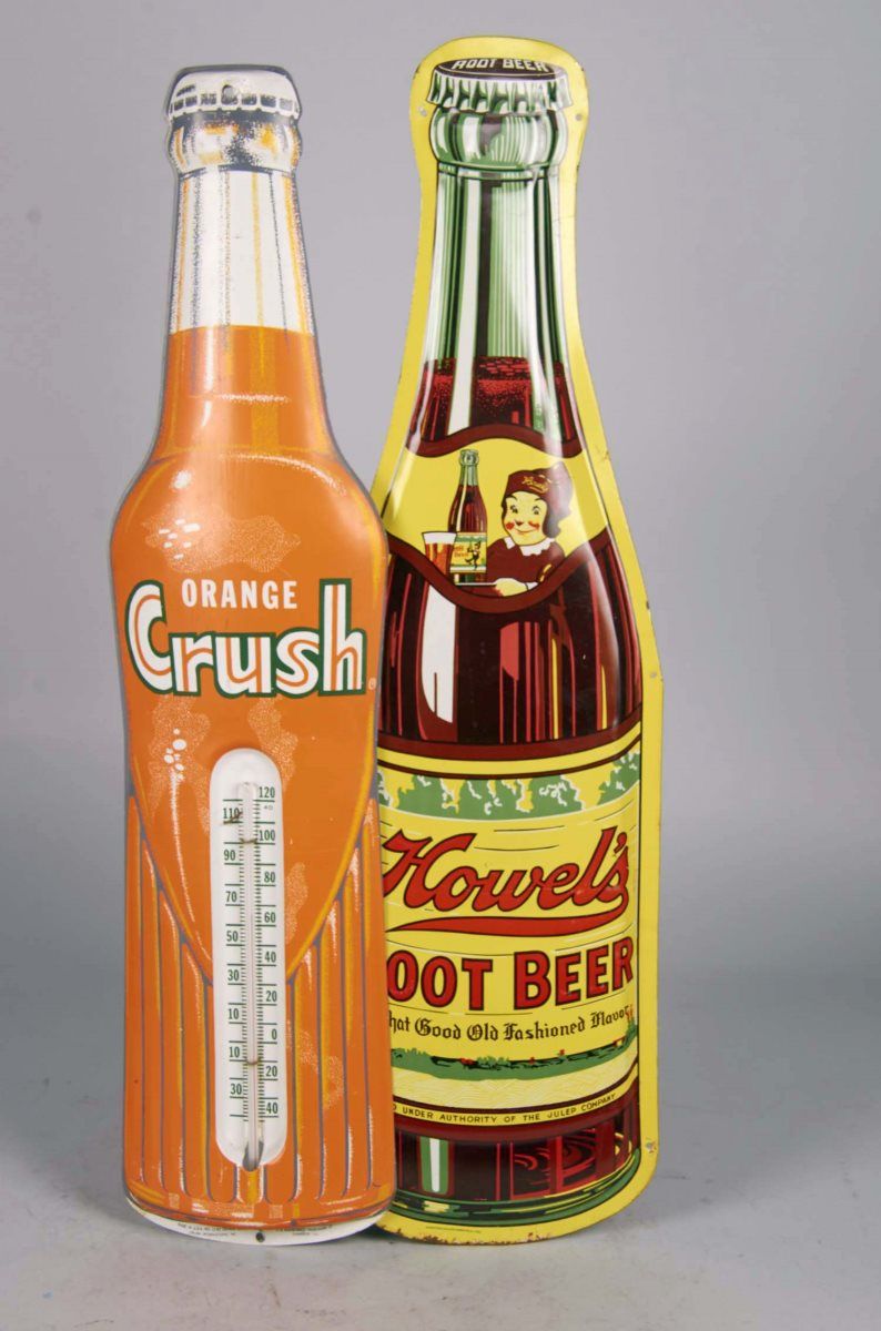 Including 1 - Orange Crush thermometer - 8.25" x 29.5", 1 - Sun Crest thermometer - 5" x 17" and 1 - Howel's Root Beer "Root Beer with that Good Old Fashioned Taste" - 7" x 28.75" Condition (Very good). Size Largest 8.25" x 29.5"