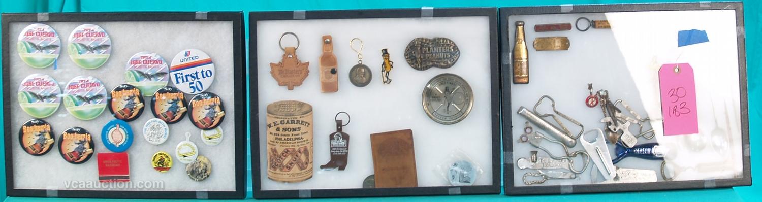 Lot Of 3 Riker Mounts Filled w/ Various Items: 1 w/ buttons, 1 w/ misc. old bottle openers, etc. & 1 w/ different advertising items including Planters Peanut Man