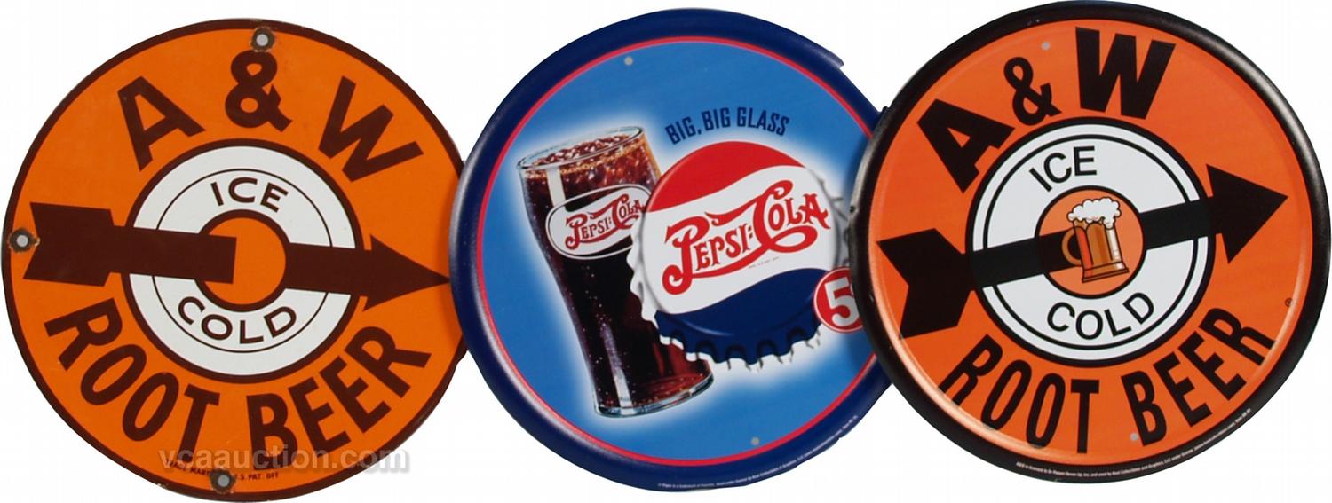 Lot Of 3 Round Beverage Signs: 1 - A&W Root Beer porcelain sign, 1 - A&W Root Beer tin sign, reproduction & 1 - Pepsi-Cola tin sign, reproduction - each 12" diam