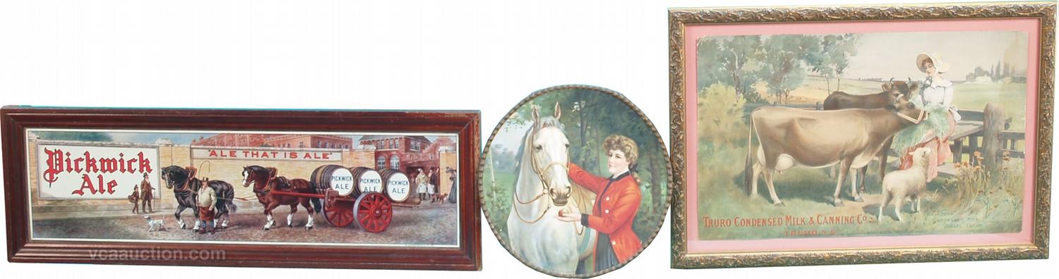 Lot Of 3 Signs: 1 - antique flue cover w/ horse & lady - 10" diam, 1 - Pickwick Ale tin sign "Ale That Is Ale" w/ cardboard backing in frame - 24" x 8" & 1 - Truro Condensed Milk & Canning Co. paper sign "Reindeer, Condensed Milk, Jersey Cream" in frame - 19" x 13"