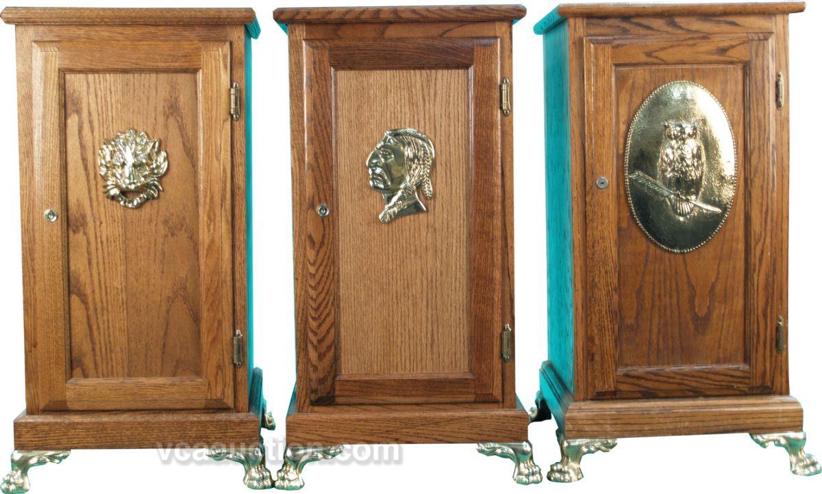 Lot Of 3 Slot Machine Stands: 1 w/ Owl Casting On Front, 1 w/ indian head casting on front, & 1 w/ lion head casting on front - Each 34" x 17" x 17" deep w/ key