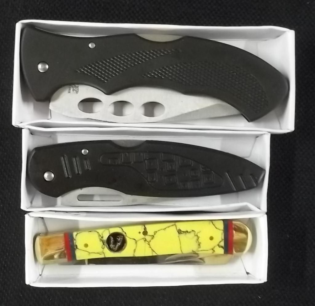 4 Blade - Spear Point, Coping, Sheepfoot and Pen- Knife W/ Brass Plated Bolsters & 420 Stainless Steel Blades. Midnight Warrior LockBack Knife, W/Stainless Steel Blade & Thumb Stud, Composition Handle Scales W/Textured Grip & Pocket Clip. Totem Spirit:Gidi LockBack Knife, W/Black Coated Stainless Steel Blade & Thumb Stud. Diamond Textured Aluminum Handle & Lanyard Hole.