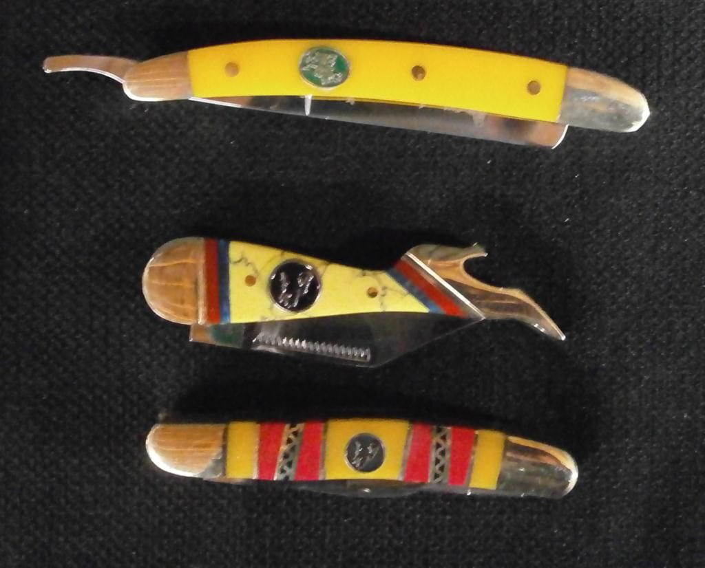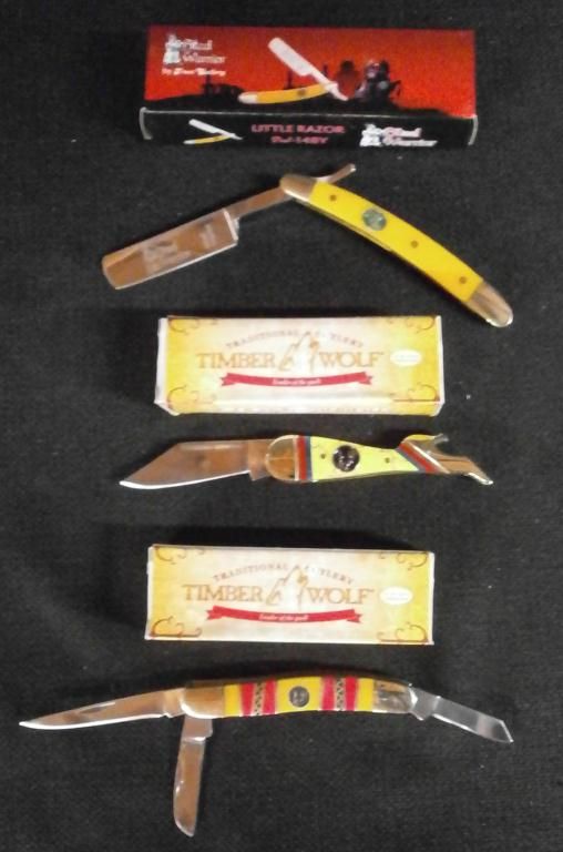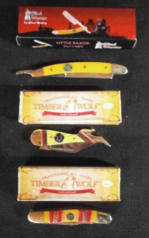 Folding 3 3/8" Knife W/Stainless Steel Blade. Timber Wolf Desert Rose Congress Folding Knife W/Stainless Steel Blades. Steel Warrior Little Razor 4" Knife W/Polished Stainless Steel Blade, Nickel Silver Bolsters & Composite Handle.