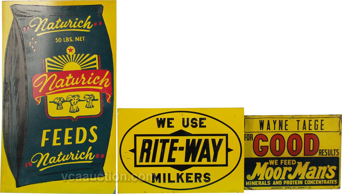 Lot Of 3 Tin Signs: 1 - Wayne Taege "We Feed Moor Man's" tin sign - 16" x 12", 1 - "We Use Rite-Way Milkers" embossed tin sign - 20" x 13" & 1 - Naturich Feeds tin sign - 18" x 30"