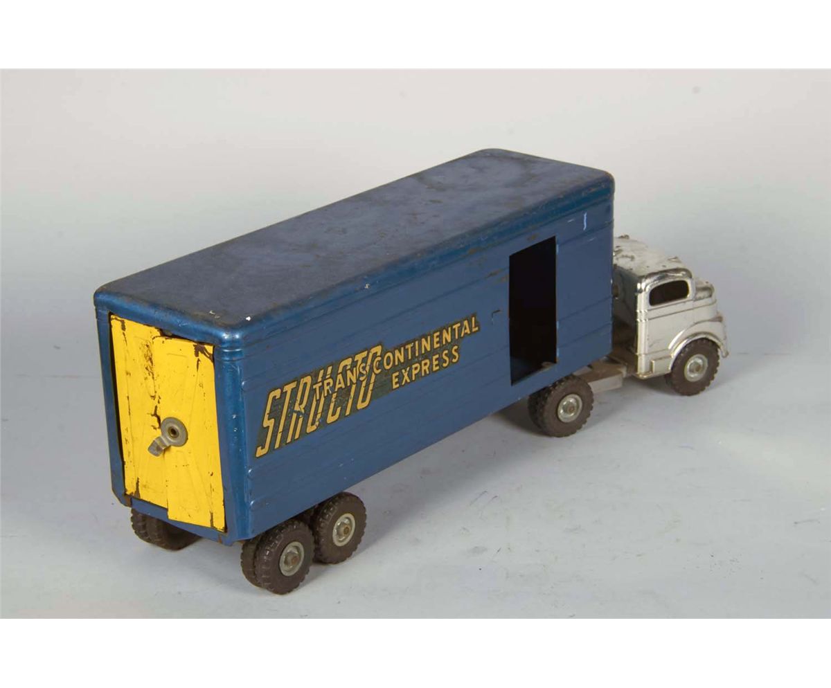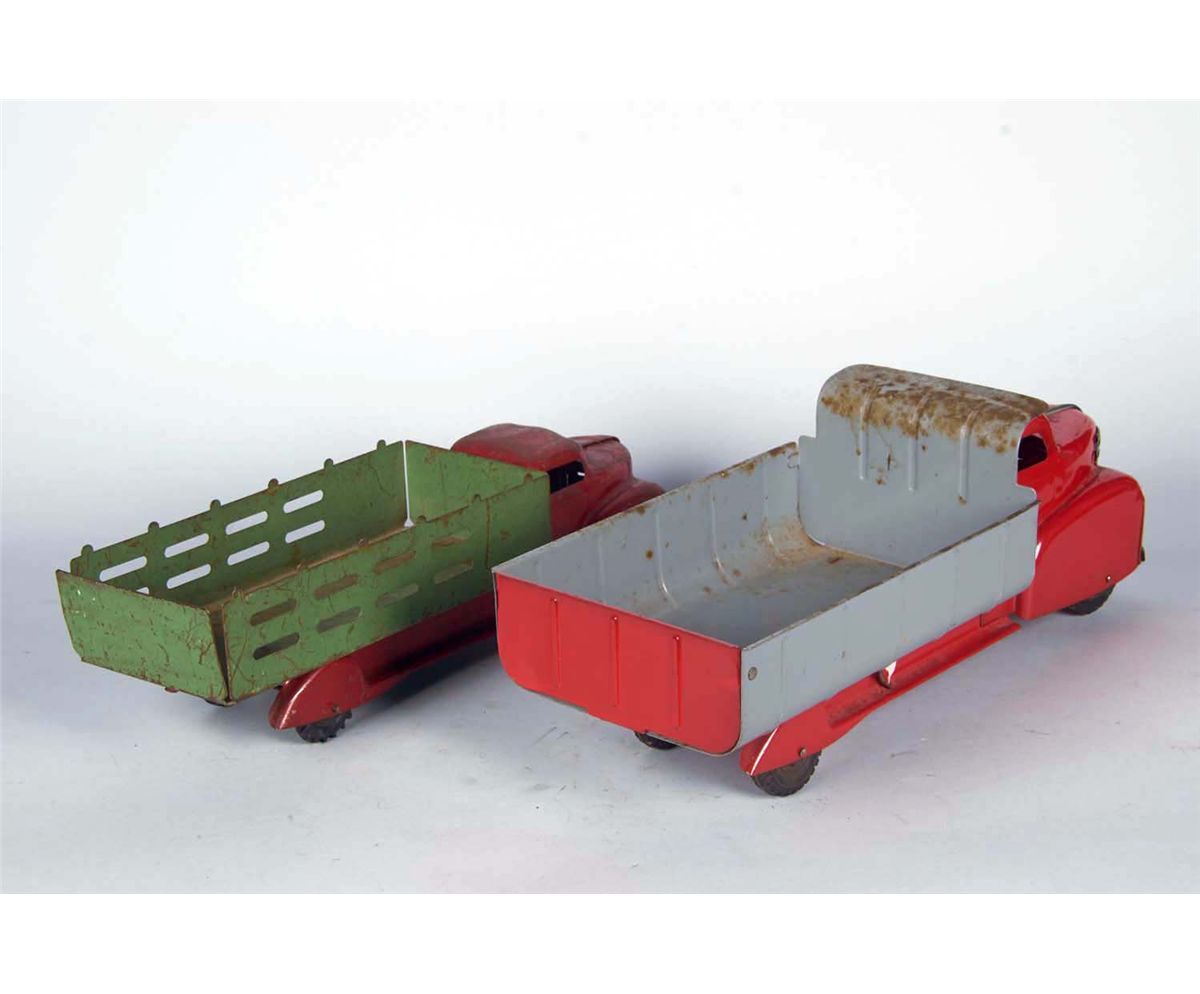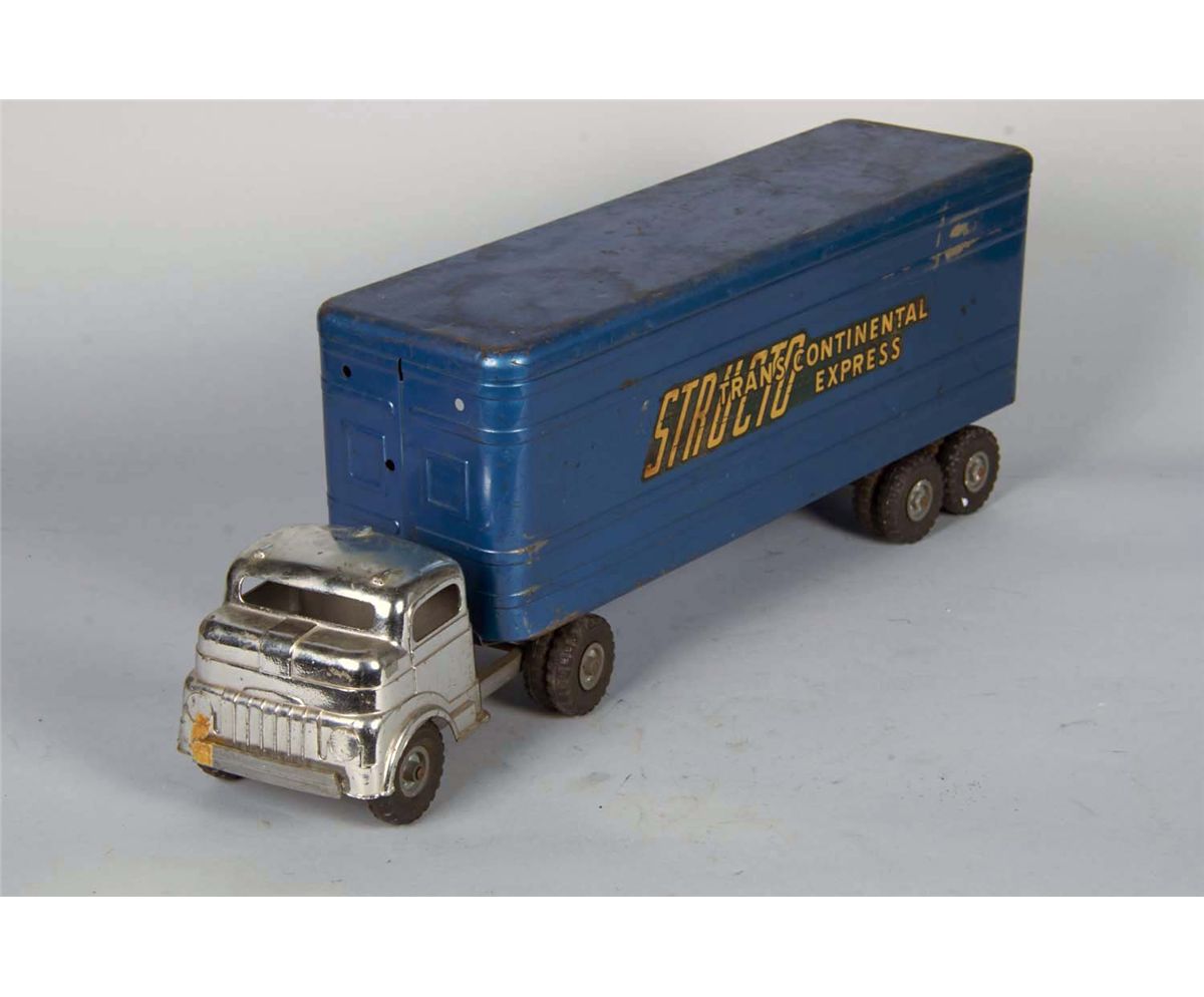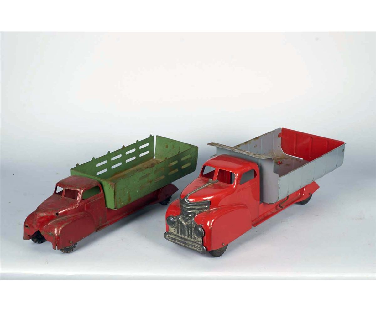 Including 1 - Red & green stake bed truck, original paint, missing grill, c1930's, 1- Red & gray Lumar dump truck w/original paint, c1930's, 1- 1950's Structo Trans Continental Express Moving Van lines truck and trailer- missing side door, has original fi