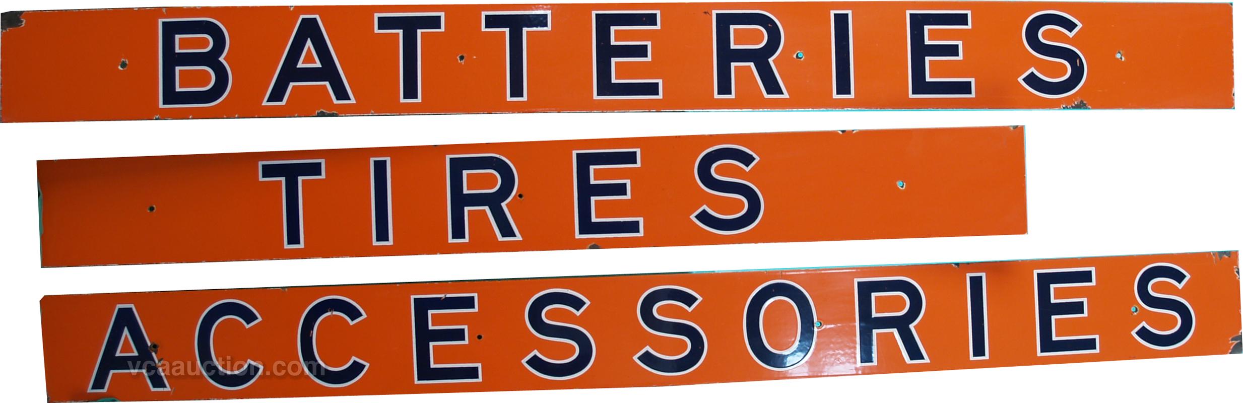 Lot Of 3 Union 76 Service Station Porcelain Signs: Tires - 48" x 5", Accessories - 60" x 5" & Batteries - 60" x 5" Orange w/ Blue Lettersall in excellent condition.