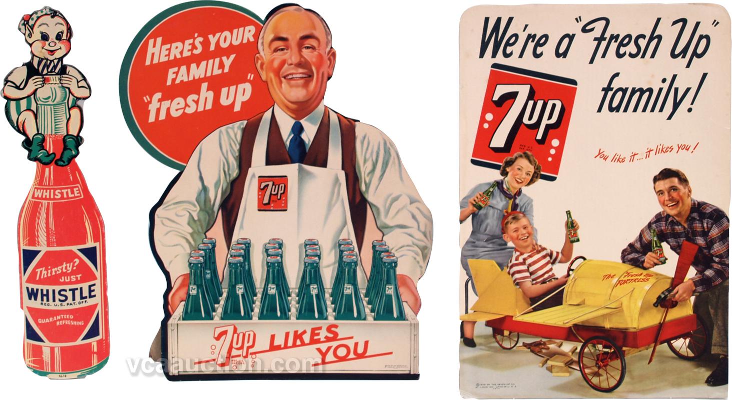 Lot Of 3 Vintage Soda Fountain Cardboard Advertisement Signs: 1 - die-cut double sided "Whistle" sign - 3" x 12", 1 - die-cut easel back "7UP" sign - 8" x 12" & 1 - easel back "7UP" sign - 8" x 12"