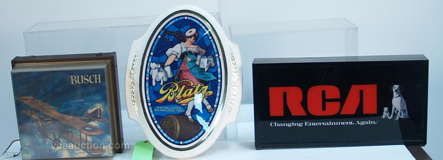 Lot Of 3 Wall Mount Light-Up Signs: 1 - metal & plastic RCA - 20" x 10", 1 - plastic Busch Beer - 12" x 12" & 1 - plastic Blatz Beer - 19" x 15"