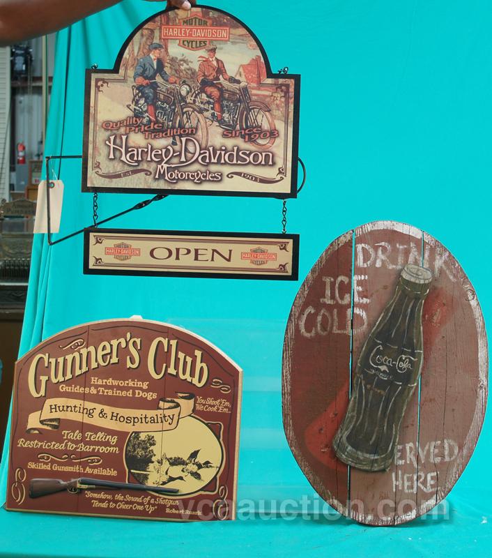 Lot Of 3 Wood Signs: Old Coca Cola Sign - 17" x 24", "Gunner's Club" - 19" x 16" & Harley Davidson Outdoor Store Sign w/ Open & Metal Hanging Bracket - 18" x 22"