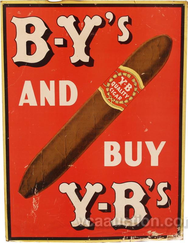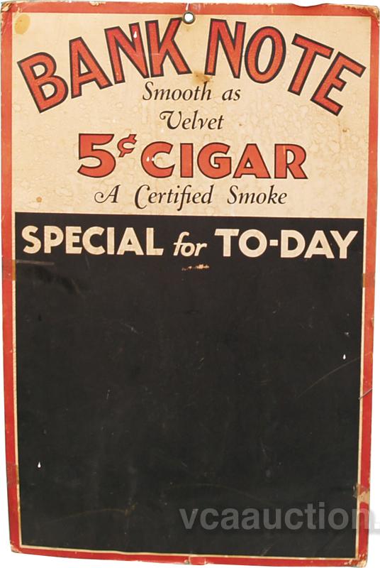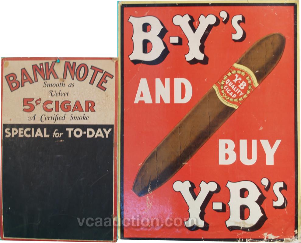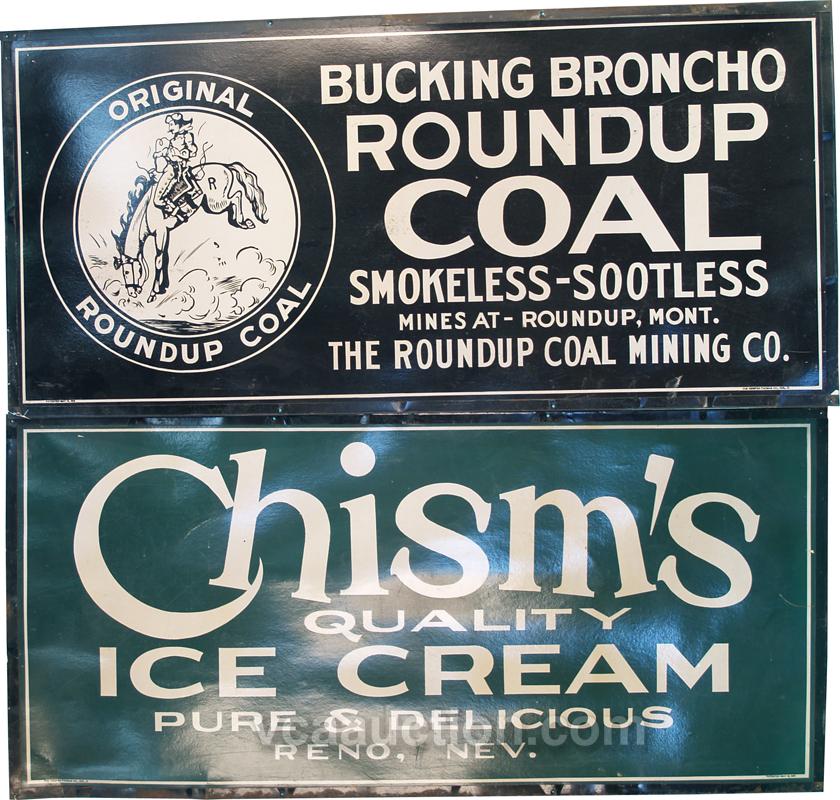 Lot Of 4 Cardboard Signs: Bank Note Smooth As Velvet 5 Cent Cigar A Certified Smoke Special For Today - 13" x 20", B-Y's And Buy Y-B's Cigar Cardboard Easel - 19" x 26", Chism's Ice Cream in metal frame - 42" x 20", and Bucking Broncho Roundup Coal in metal frame - 42" x 20".