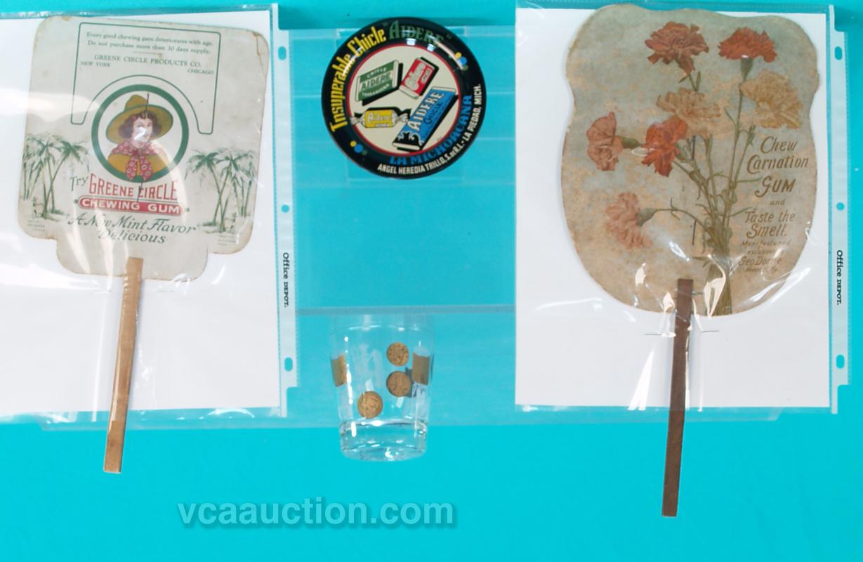 Lot Of 4 Chewing Gum Items: 1 - Carnation Gum hand fan w/ wood handle, 1 - Green Circle Gum hand fan w/ wood handle, 1 - bar shot glass w/ gold gum machines & old coins & 1 - Insuperable Chicle "Aidere" round tin tip tray (Mexico) - 4-1/2" diam