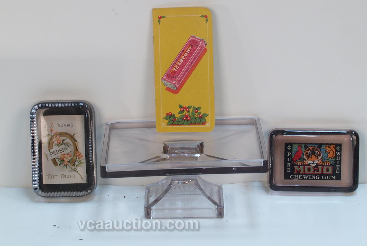 Lot Of 4 Chewing Gum Items: 1 - Adams Tutti Frutti glass paper weight, 1 - MO-JO Gum glass paperweight, 1 - c1928 Clark's Teaberry Gum pocket notebook (unused) & 1 - Clark's Teaberry embossed glass stand, for holding gum box