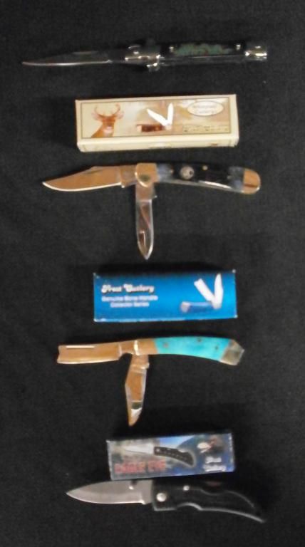 Stainless Steel Serrated Blade, Black Vented Composition Handle & Thumb Hole. Little 2 3/4" Razor Folder W/ Genuine Bone Handle, Stainless Steel Blade & Nickel Silver Bolsters & Custom Frost Shield. Whitetail Copperhead 3 1/4" Pocket Knife W/Polished Stainless Steel Blade, Nickel Silver Bolsters, & Genuine Jigged Bone Handle. 4" Pocket Knife W/Stainless Steel Blade & Plastic Overlay Handle W/Dragon