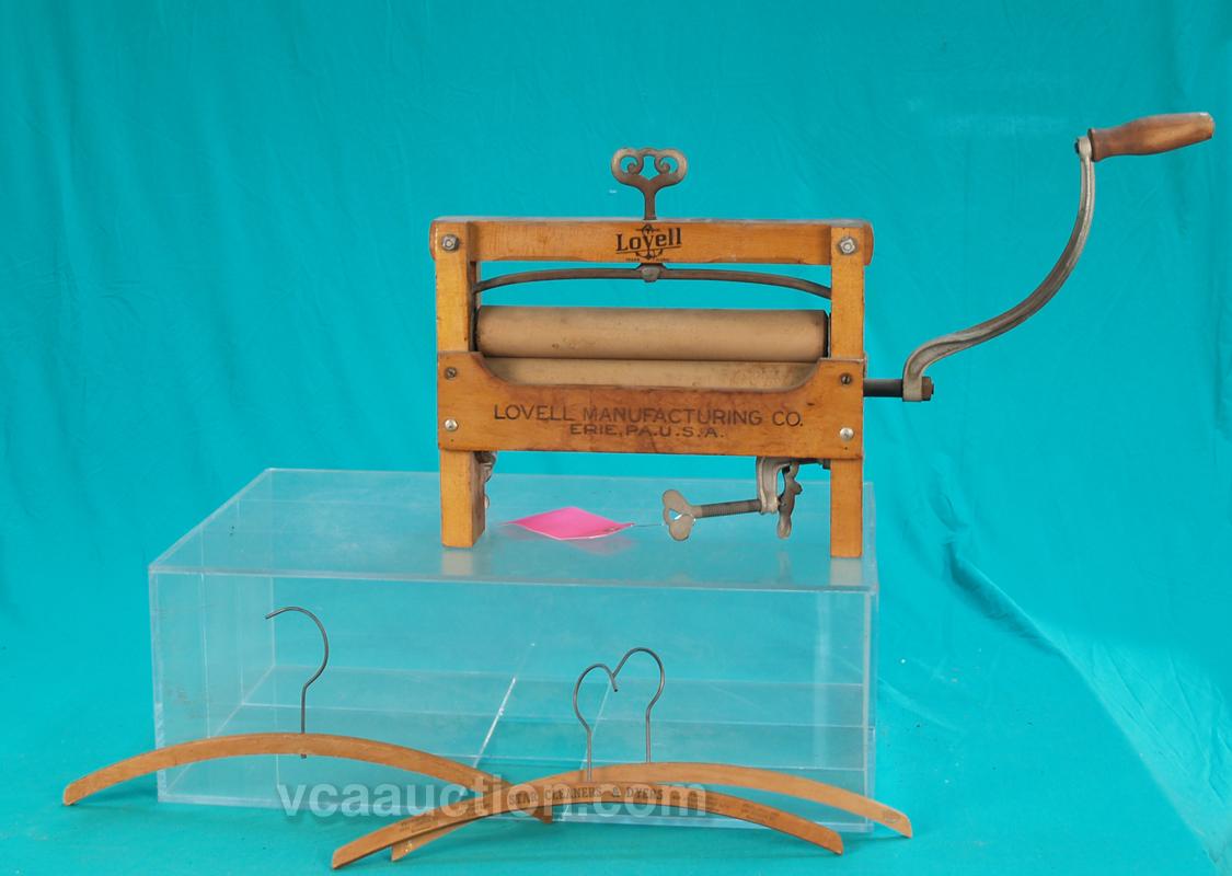 Lot Of 4 Early Items: 3 - early wooden hangers from various different cleaners & 1 - Lovell clothes wringer