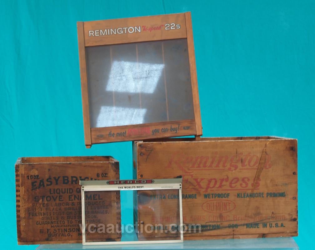 Lot Of 4 Early Items: 1 - Remington Express 500 Shot Shells wood crate - 15" x 10" x 9", 1 - Remington "hi-speed" 22's bullet display case - 12" x 6" x 13", 1 - HERCO Cigars tin & glass cigar box lid & 1 - Easy Bright Liquid Oil Stove Enamel wood crate - 10" x 10" x 8"
