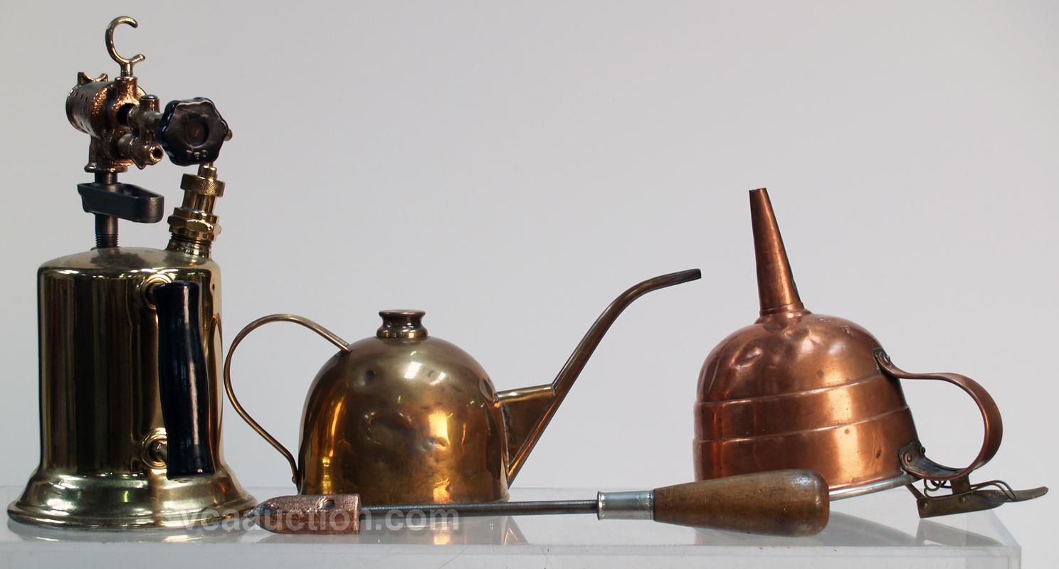 Lot Of 4 Early Items: 1 - brass blow torch restored, 1 - funnel, 1 - oil can & 1 - soldering iron