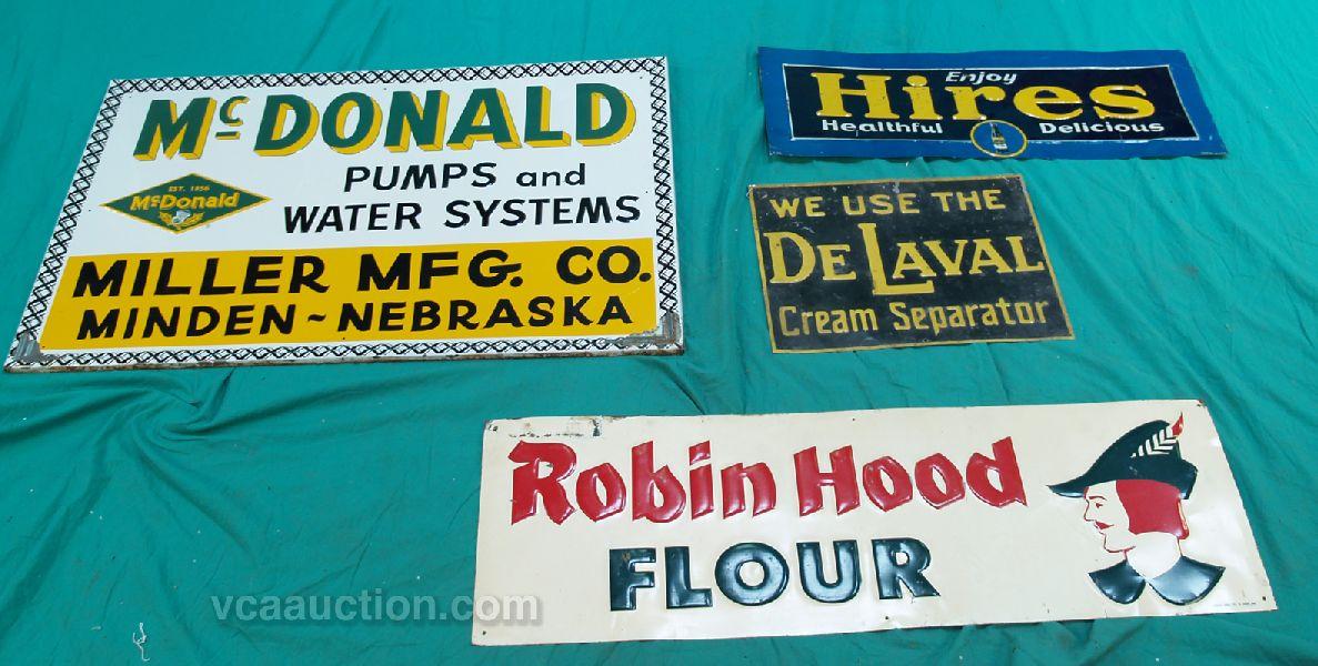 Lot Of 4 Embossed Tin Signs: 1 - Robin Hood Flour - 35" x 11", 1 - DeLaval - 16" x 12", 1 - Enjoy Hires - 27" x 9" & 1 - McDonald Pumps & Water Systems - 34" x 22".