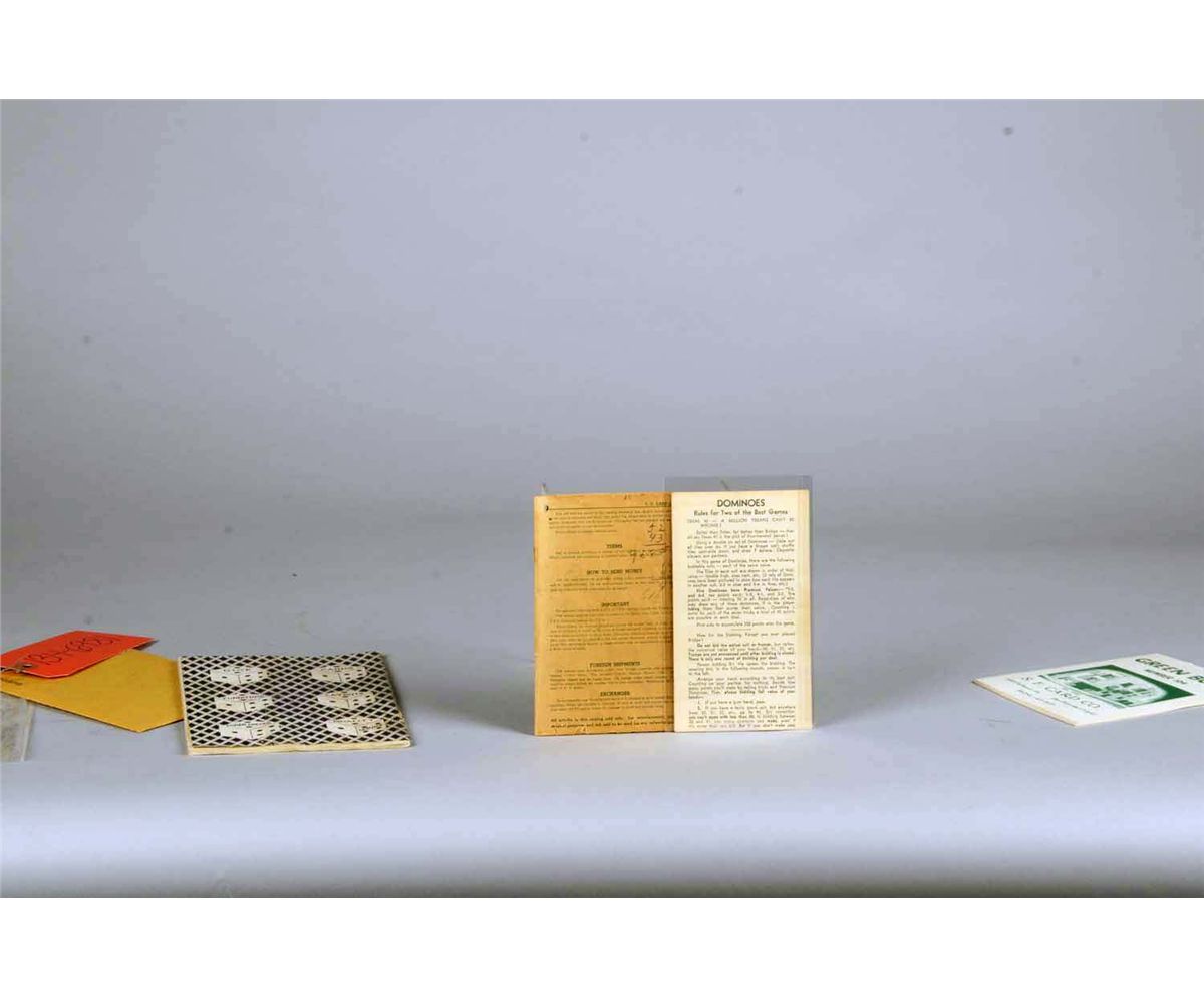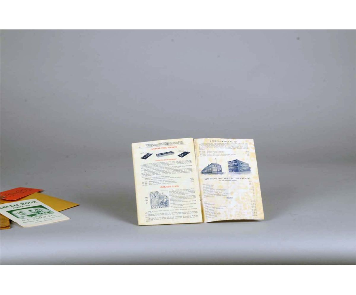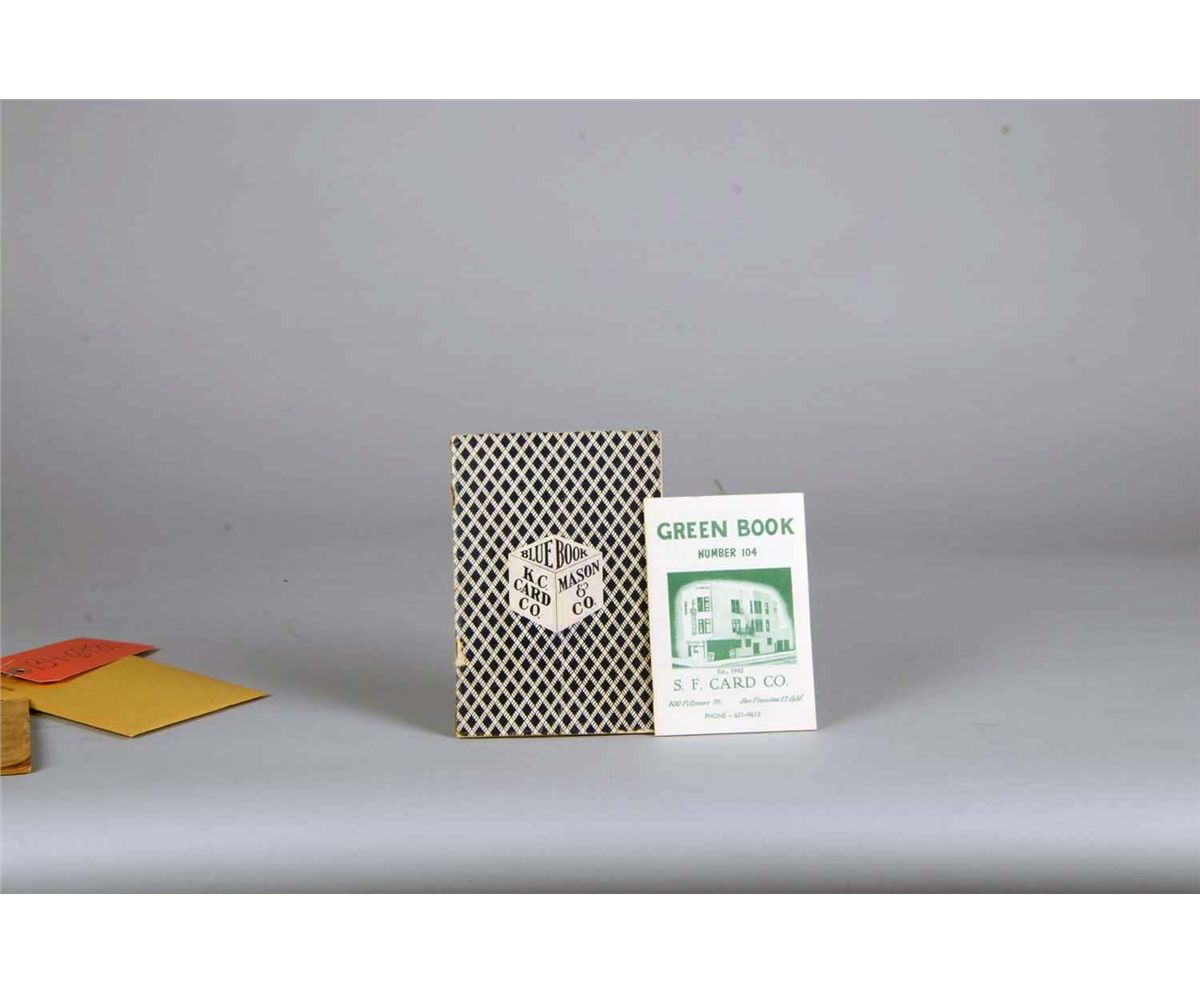 1 - "K.C. Card Co. Mason & Co. Blue Book" catalog c1931, "Dice, Cards, Furniture, Layouts, Poker Checks, Quality Service", Good condition w/ some wear - 5" x 7-1/2", 1 - "S.F. Card Co. Green Book Number 104" catalog, Excellent condition - 4" x 6", 1 - "Do