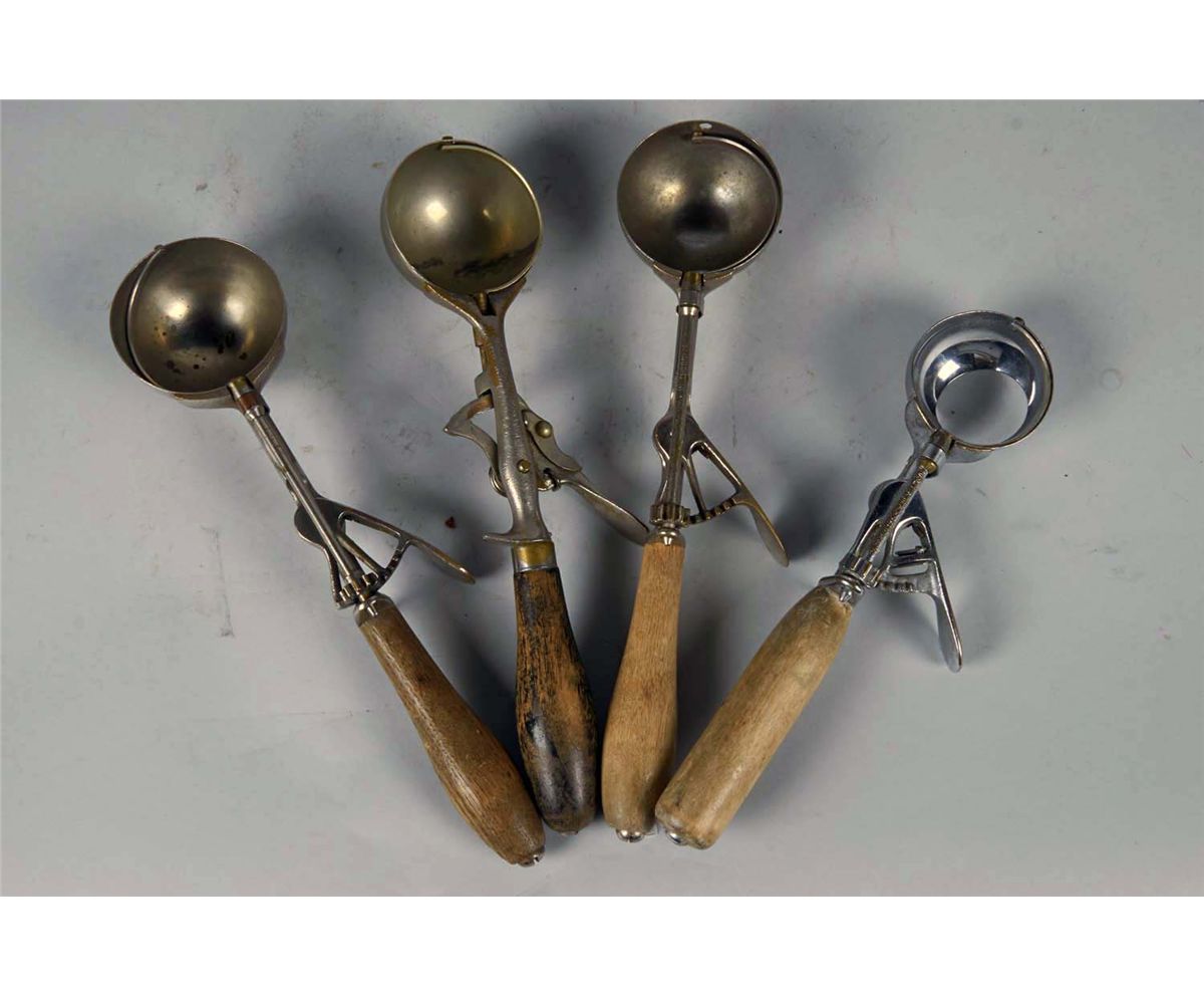 All with wooden handles including 1 - F.S. Co. Clipper No. 4 size 12, Pat. 1919 (11" L), 1 - Gilchrist's No. 31 size 10 (11" L), 1 - Hamilton Beach No-Pak 31, Pat. 1862537 size 20 (9.25" L), and 1 - Gilchrist's No. 31 size 12 (11" L) Condition (Good). Siz
