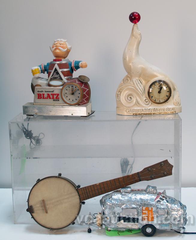 Lot Of 4 Items: 1 - countertop "Carstairs White Seal" clock display seal statue, 1 - countertop "Blatz" plastic light-up figural display, 1 - Stella small banjo & 1 - countertop light-up Airstream camper model (homemade)