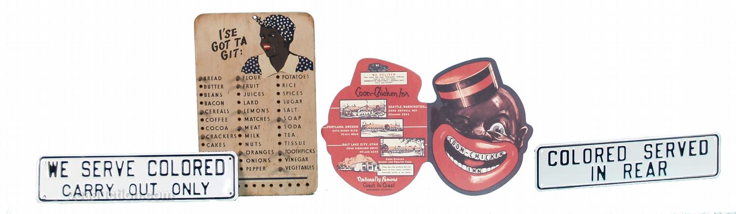Lot Of 4 Items: 1 - Coon-Chicken Inn menu (repro), 1 - wooden shopping list w/ pegs "It's Got Ta Git" - 7" x 11" & 2 - embossed tin signs: "Colored Served In Rear" & "We Serve Colored Carry Out Only" - each 12" x 3"