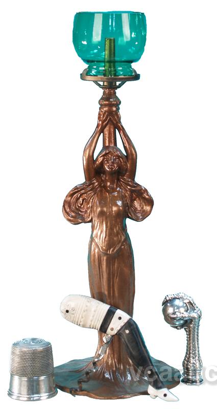 Lot Of 4 Items: 1 - sterling eagle talon w/ ball cork, 1 - sterling thimble style whiskey shot glass, 1 - ladies leg corkscrew (maybe ivory) & 1 - art nouveau lady figure countertop cigar lighter w/ green glass globe - 13" tall