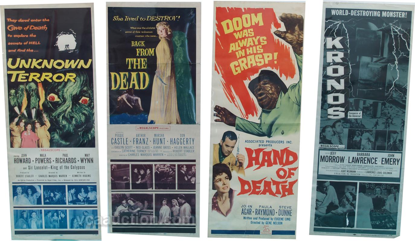 Lot Of 4 Old Horror Movie Posters: 1 - Back From The Dead, 1 - Krons, World Destroying Monster!, 1 - Hand Of Death & 1 - Unknown Terror - each 14" x 32"